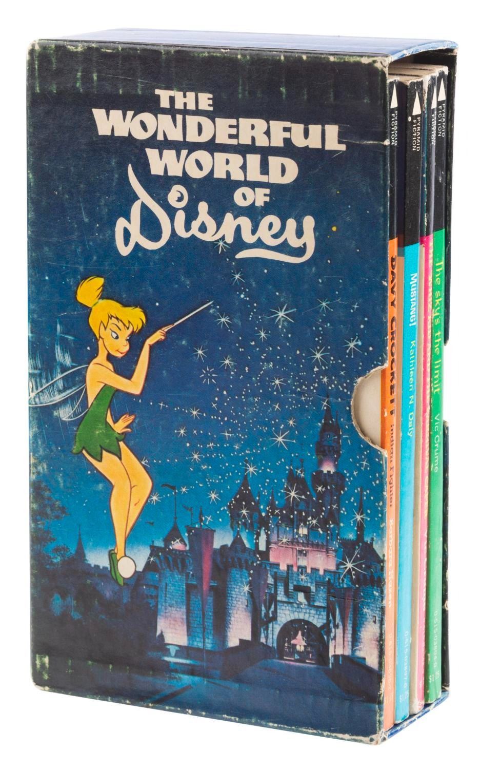 (Pyramid Books, 1975) A box set of four The Wonderful World of Disney books. Each book contains a story from the show, including Davy Crockett, Mustang! The Whiz Kid and the Carnival Caper, and The Sky's the Limit. Measuring 4.25" x 7" each, the books display in good condition with wear to the edges, corners, and spine. The books come in the original slipcase in good condition with wear throughout.