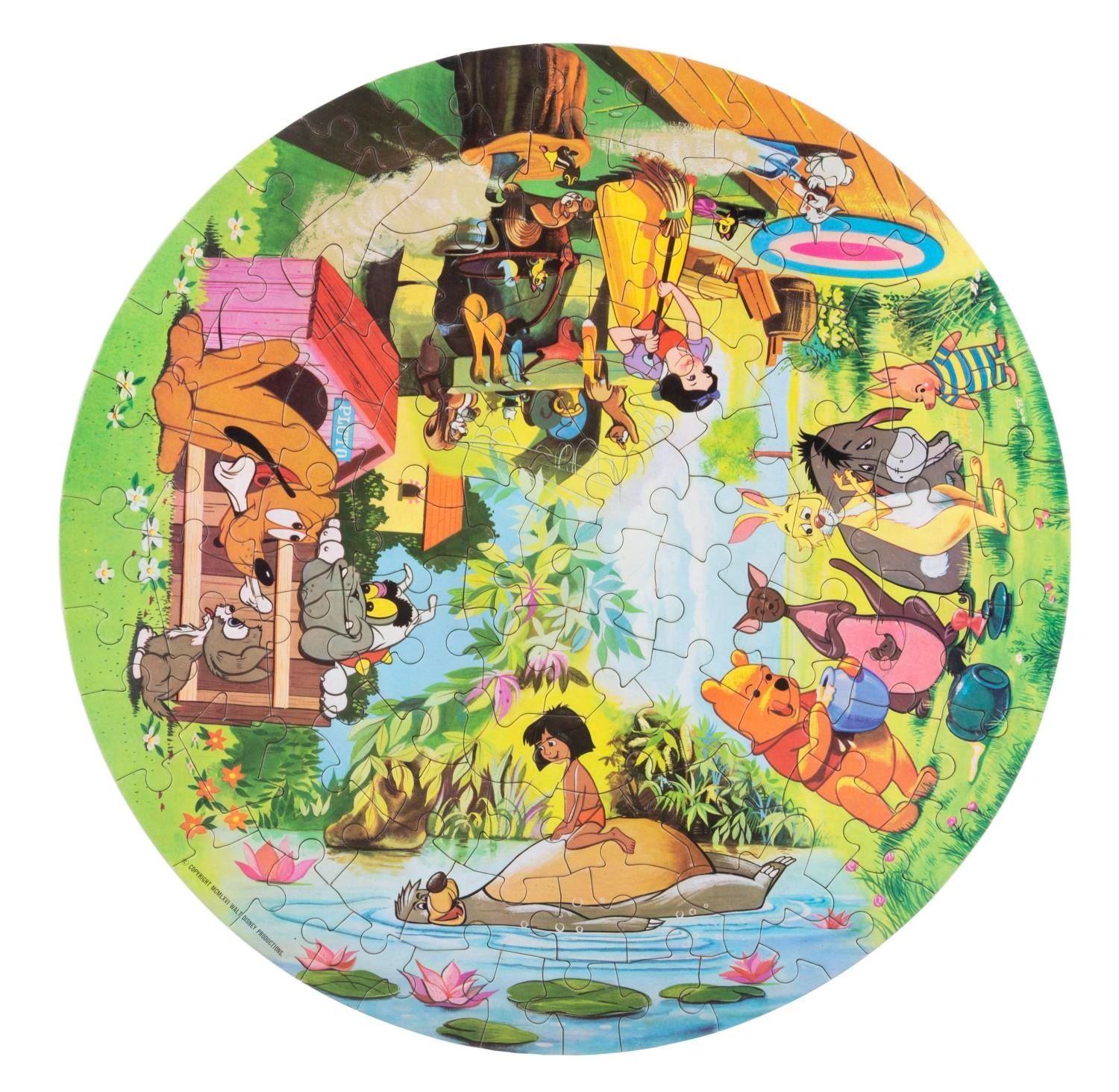 (Waddington's, 1966) A complete "The World of Disney" circular jigsaw puzzle. When assembled the 102-piece puzzle creates an 18" diameter image featuring characters from "Snow White and the Seven Dwarfs," "The Jungle Book," "Winnie the Pooh," and Pluto and Friends. The pieces are all in fine condition. The 13" x 13" x 1" box is in fair condition with warping, yellowing tape remnants and residue, edge and corner wear, areas of surface loss, and creasing.