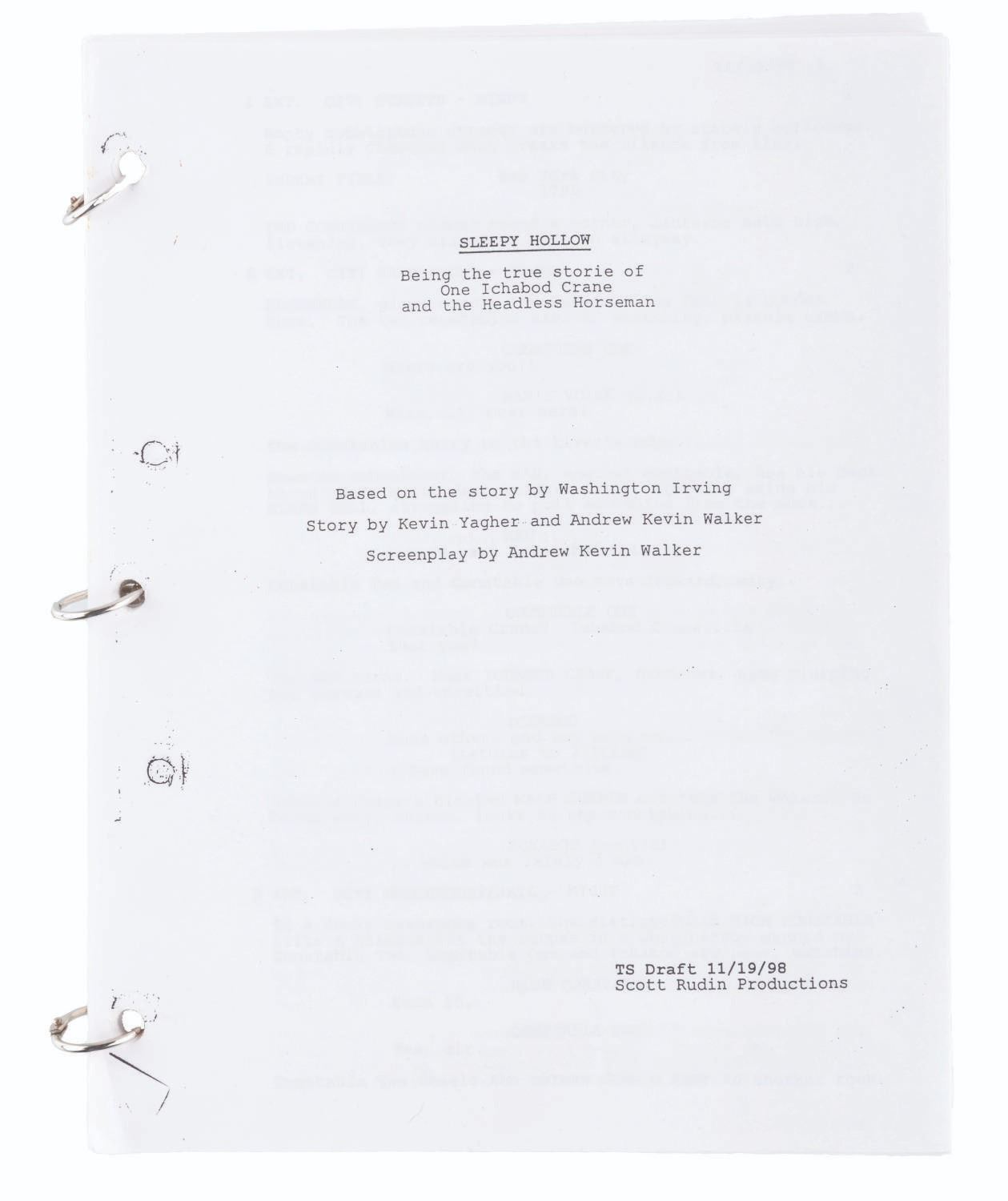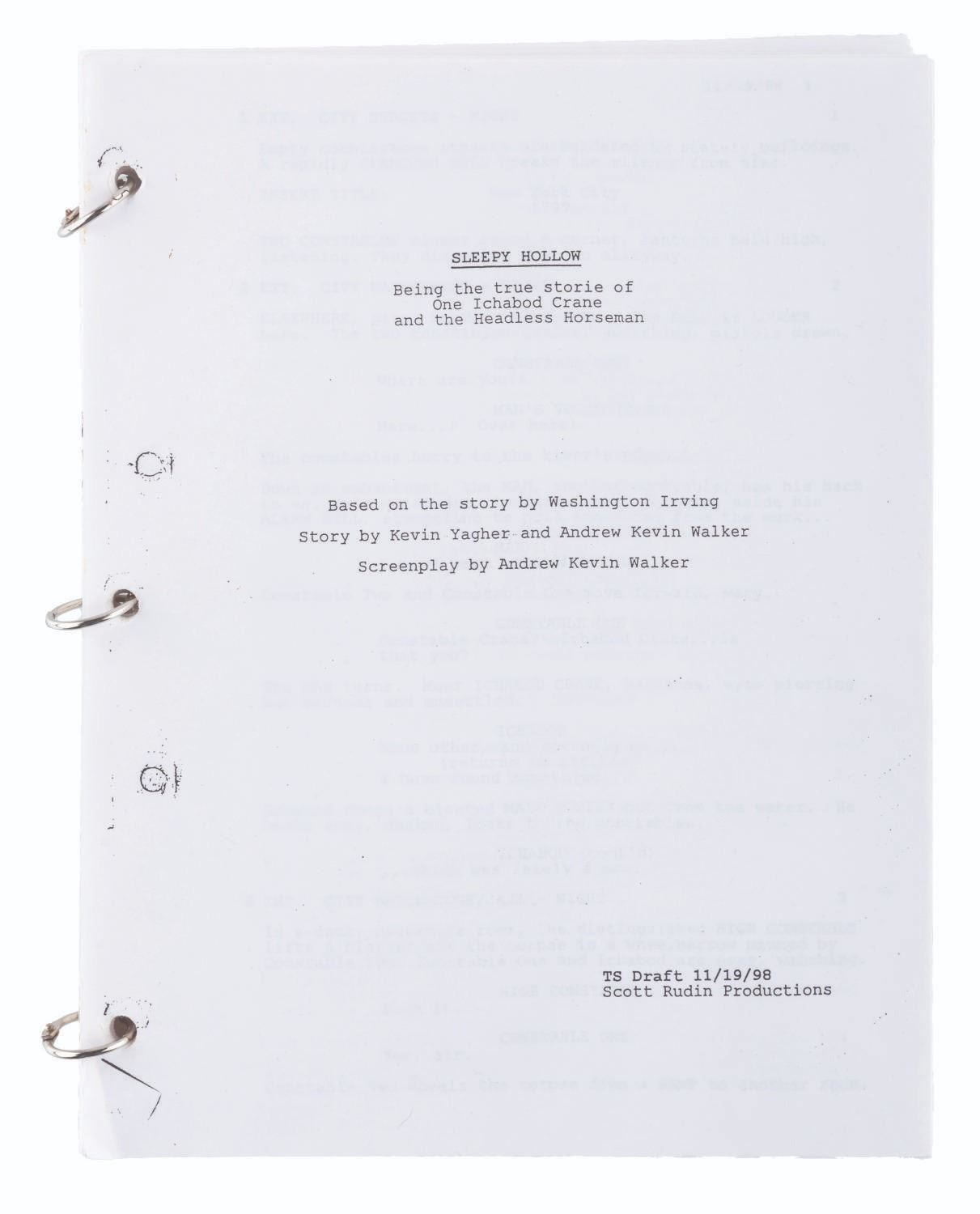 (Paramount, 1998) A screenplay for the Tim Burton film "Sleepy Hollow,” starring Johnny Depp and Christina Ricci. The 222-page script by Andrew Kevin Walker is dated November 19, 1998, just as the production started filming. This is a post-production photocopy printed for use at Industrial Light & Magic. Measuring 8.5” x 11” x 0.5”, the script is in very good condition with typical light edge wear.