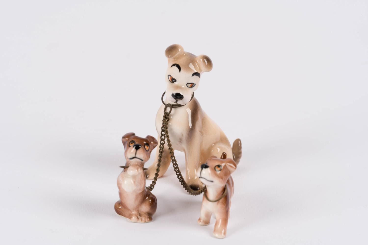 (Goebel, 1950s) A figurine set of Tramp chained with two puppies from "Lady and the Tramp" by German ceramist, Goebel. Measuring 1.75" x 1" x 2.5" tall, and 0.5" x 1.25" x 1.25", the ceramic figurines are in very good condition with minor imperfections to the glaze, including crazing from age.