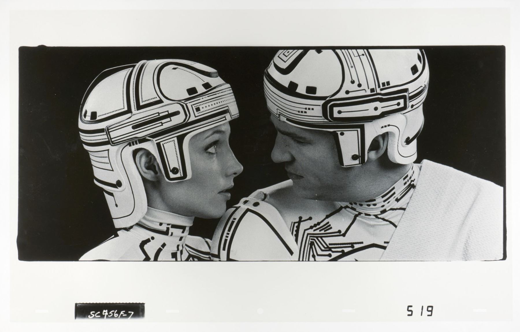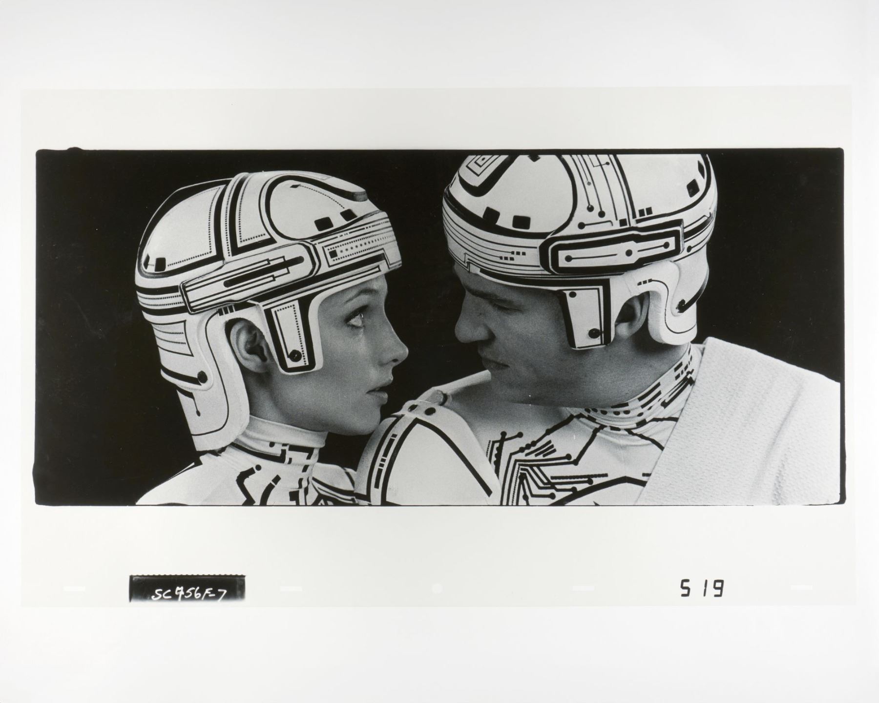 (Disney, 1982) An original Ektachrome continuous-tone transparency cel from "Tron" featuring Yori and Flynn. The Ektachrome cel was created at the Studio and used during the production of the special effects sequences in the film. The ground-breaking film predated modern-day computer animation, requiring the unique lighting effects to be hand-created frame by frame. This painstaking process was only used for "Tron," making the film's effects artwork a special piece of Disney and cinema history. Measuring 12.5" x 20" with an image size of 8.5" x 17". The transparency cel is in very good condition with some light scratches and wear typical of production use.