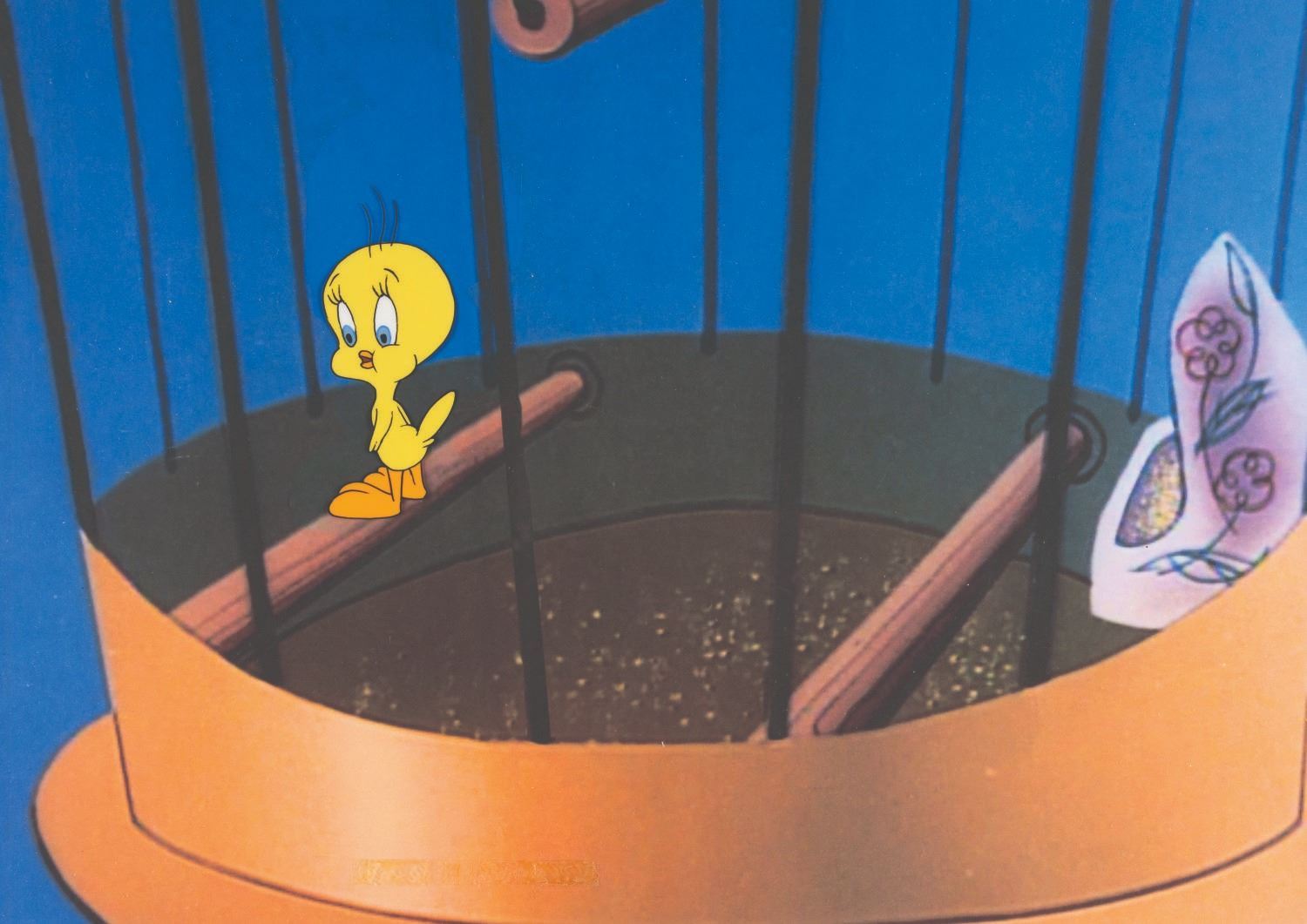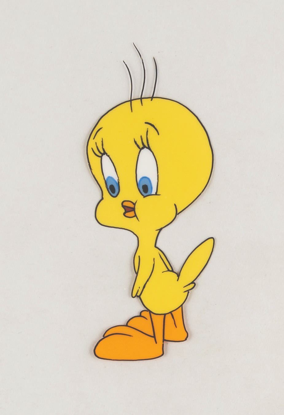 (Warner Bros. 1956) An original hand-painted production cel of Tweety Bird from the Merrie Melodies short "Tree Cornered Tweety." With an image size of 1.5” x 3.5” on a 10.5” x 13.5” cel and paired with a color copy reproduction background, the piece is in very good condition with surface scratches and tape residue which does not affect the image.