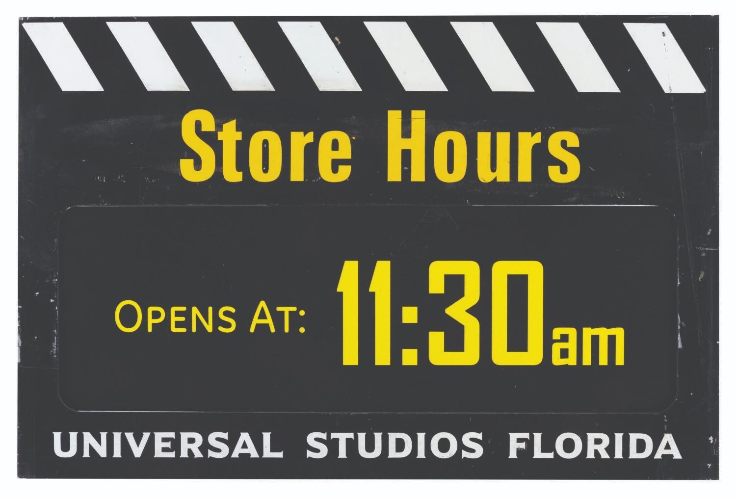 (Universal, 1990s-2000s) A Universal Studios Florida store hours sign for a restaurant near Mel’s Drive-In. The metal sign includes a foam core board that can be slid in and out, displaying "Opens at: 11:30 am” on one side and "Sorry We Missed You, Please Visit Us at Mel’s Drive-In” on the reverse. Measuring 10.5” x 15.5”, the sign displays in good condition with heavy scratches, scuffs, tape residue and wear from park use.