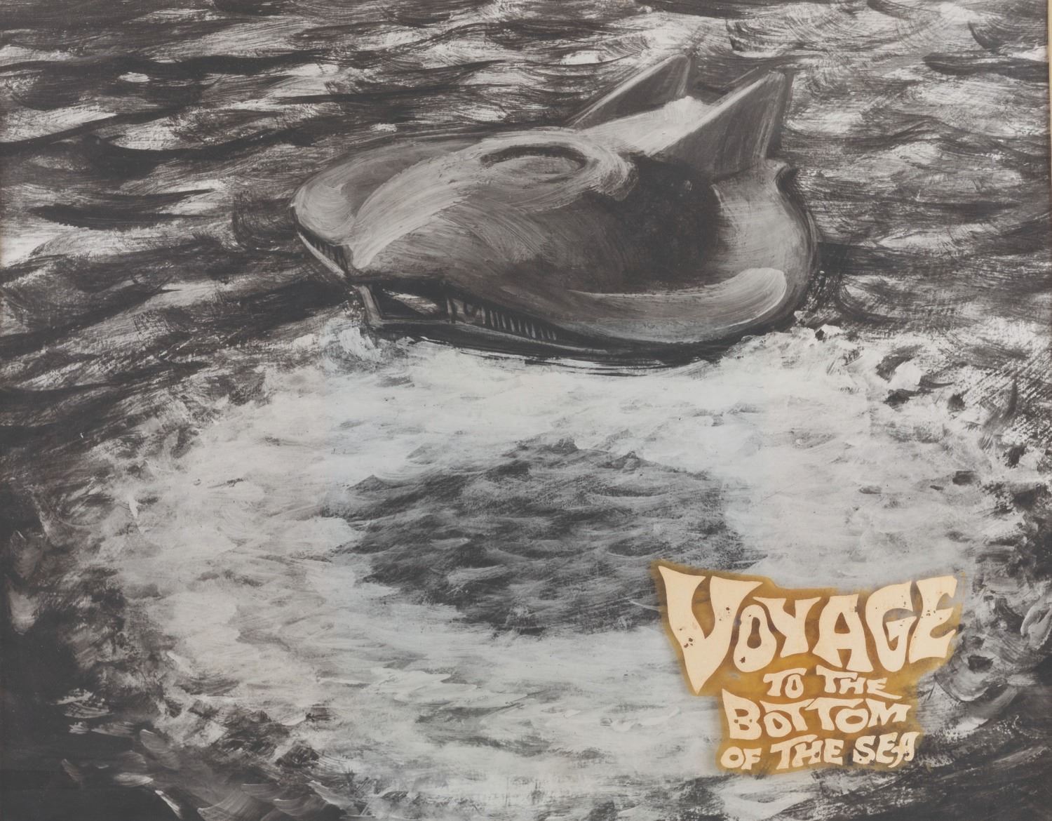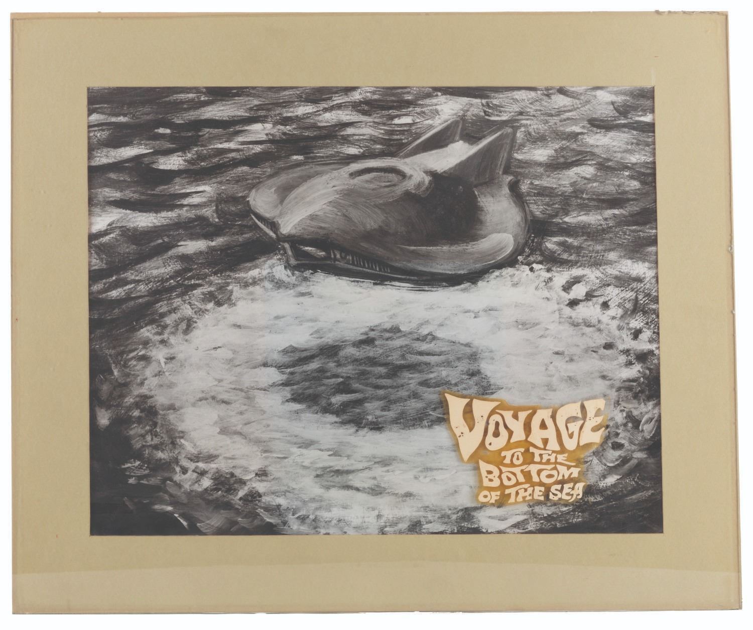 (20th Century Fox/Pacific Title, 1961) An original title concept for the sci-fi disaster film, "Voyage to the Bottom of the Sea.” The piece was hand-painted on glass at Pacific Title and is paired with a printed photo background in a matte. With an image size of 3.75” x 5.5” on 20.25” x 24.25” glass, the art is in good condition with paint loss, edge wear, and 2.5” of the glass missing at the top right corner. The 16” x 20” print in a 20.25” x 24.25” matte is in good condition with heavy discoloration to the matte.