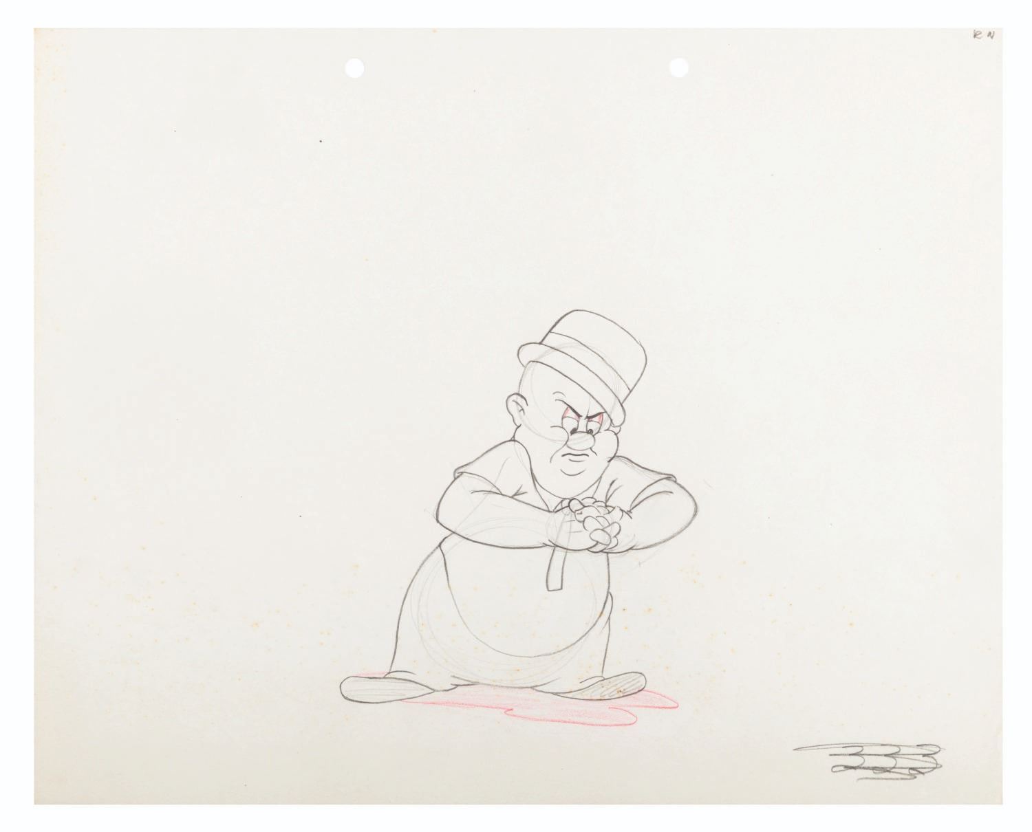 (Schlesinger, 1941) An original storyboard panel featuring Elmer Fudd from the Merrie Melodies short "Wabbit Twouble” directed by "Wobert Cwampett.” Accomplished in graphite and colored pencil, and measuring 9.5” x 12” with a character image size of 5” x 4.25” the drawing displays in good condition with spots of discoloration, light creases, and edge wear.