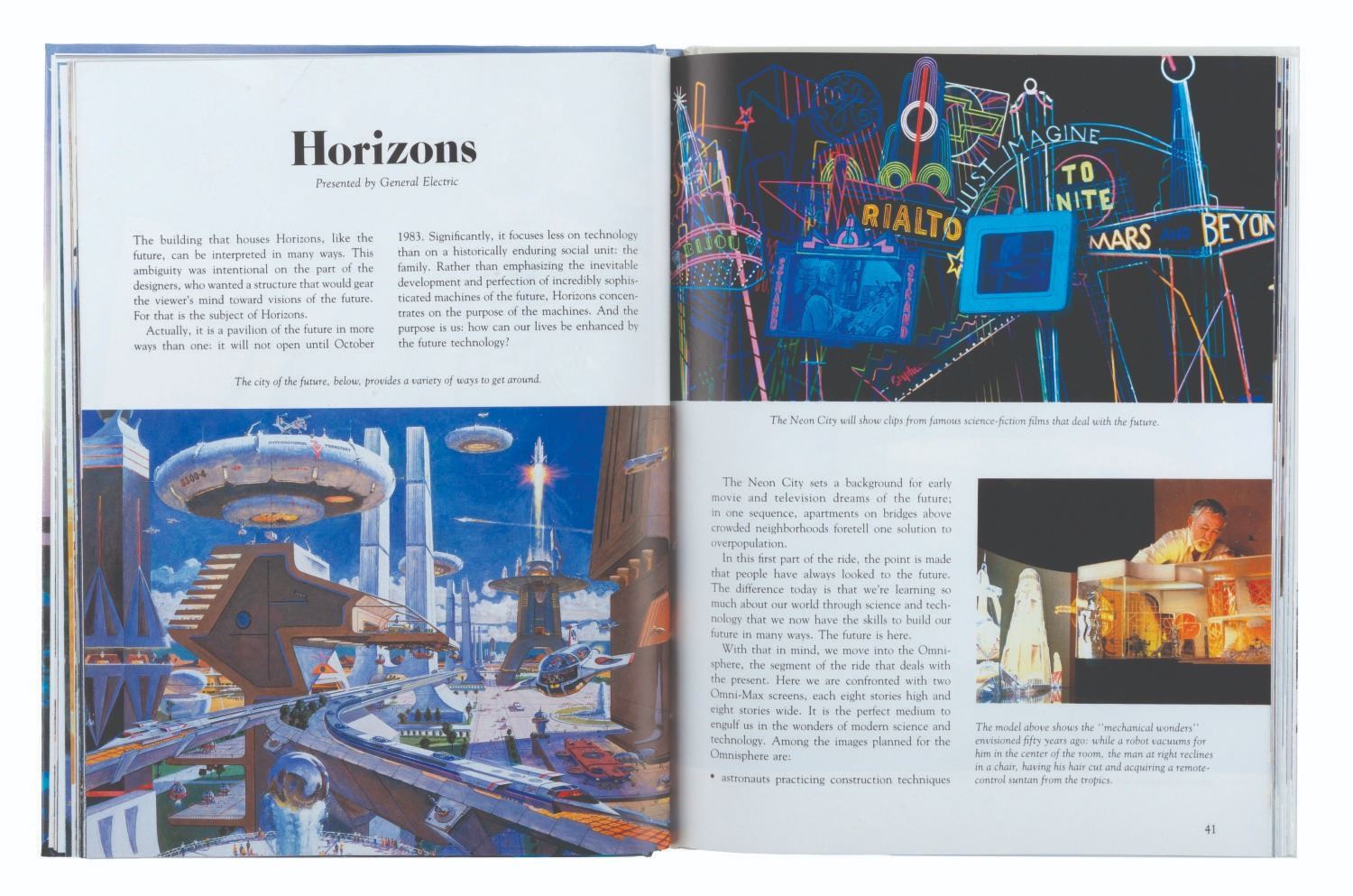 (Abrams, 1982) A Walt Disney's EPCOT Center: Creating the New World of Tomorrow book featuring the story of the Park's creation and behind-the-scenes photos. Measuring 9.75" x 12.5", the 240-page hardcover book is in very good condition with light wear at the bottom of the spine.