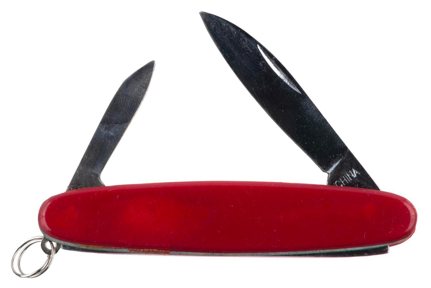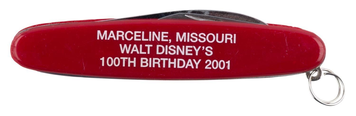 (2001) A pocket knife commemorating the 100th anniversary of Walt Disney's birthday from his boyhood home of Marceline, Missouri. The knife has two blades measuring 1" and 1.75". Measuring 3.25" x 0.5" x 0.25", the pocket knife is in very good condition with light scratches.