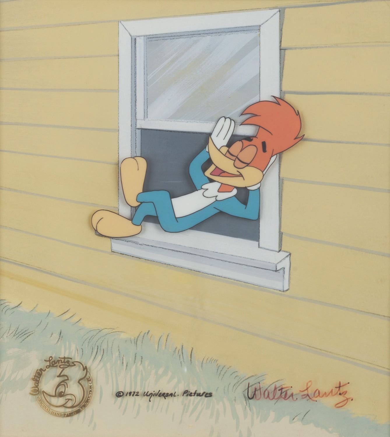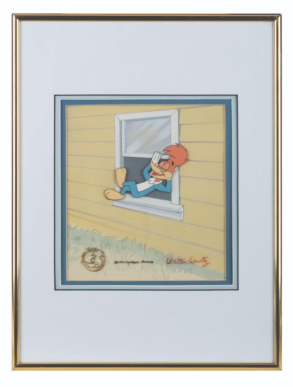 (Lantz, 1970s) An original production cel of Woody Woodpecker from an unknown Walter Lantz cartoon. Lantz signed the bottom right of the cel, which features a Walter Lantz studio seal, and a 1972 copyright mark. With a character image size measuring 3” x 4” on an 8” x 7” visible cel in a 16.25” x 12.25” frame and matte, the cel displays in very good condition with light waviness from age.