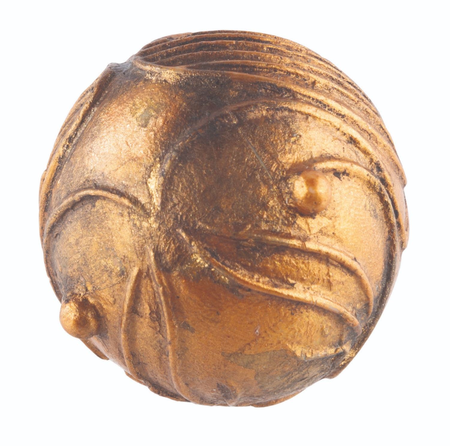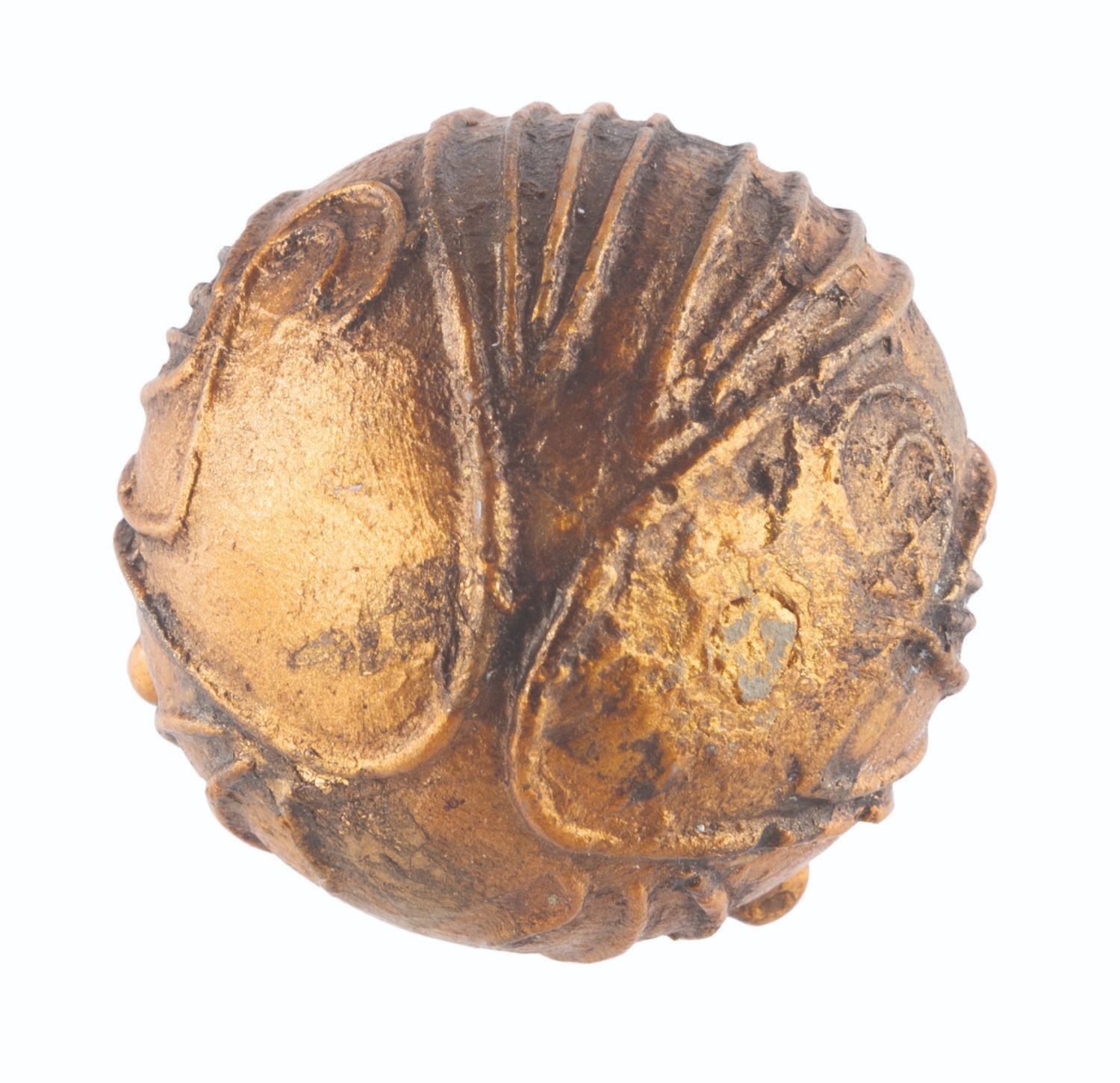 (Universal, 2014) A Golden Snitch prop from The Wizarding World of Harry Potter at Universal Studios Florida, part of a store display at Quality Quidditch Supplies in Diagon Alley. Measuring 4” in circumference, the prop displays in good condition with missing wings and a small area of paint loss from where the piece was originally mounted.