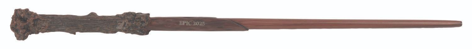 (Universal, 2025) A promotional wand for the upcoming opening of the Ministry of Magic area of the Wizarding World of Harry Potter at Universal Epic Universe in Florida. Accomplished in resin with "EPIC 2025” etched onto the side and measuring 13.75”, the wand is in fine condition. The presentation box measuring 15.75” x 3” x 1.75” displays in good condition with scuffs and indentations to the lid.
