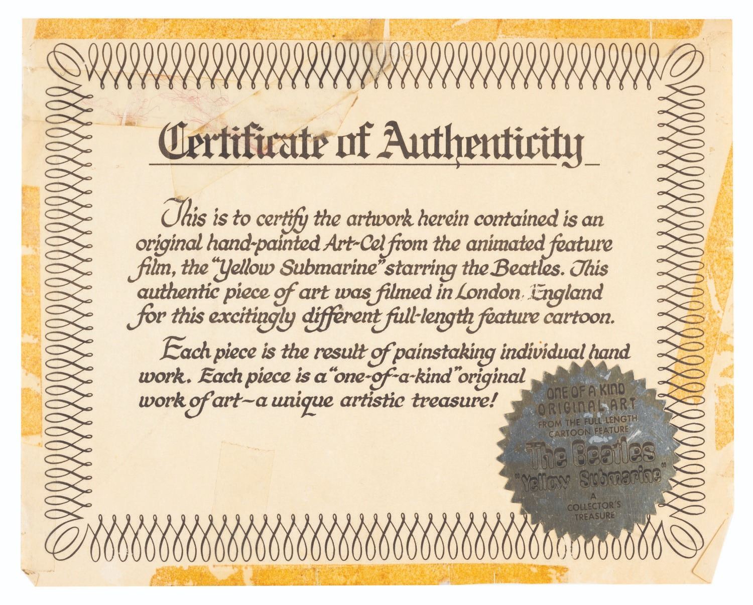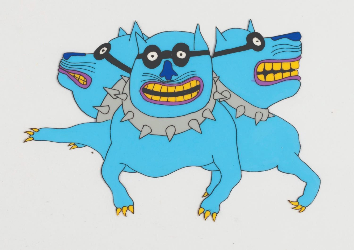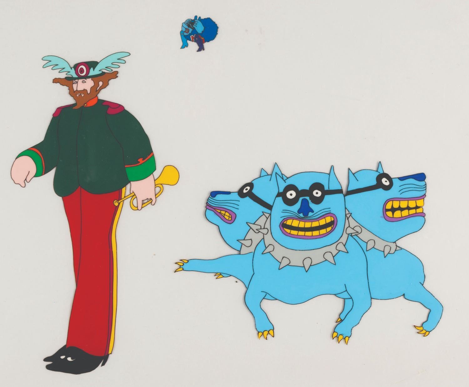 (United Artists, 1968) An original hand-painted production cel of the Four-Headed Bulldog, Ringo Starr as a member of Sgt. Pepper’s Lonely Hearts Club Band, and the Chief Blue Meanie from "Yellow Submarine.” With an image size of 8” x 10” on a 12.5” x 16” multi-layer cel, the piece is in good condition with spots of paint loss, staple holes at the corners from display, scratches, and wear from production use.
