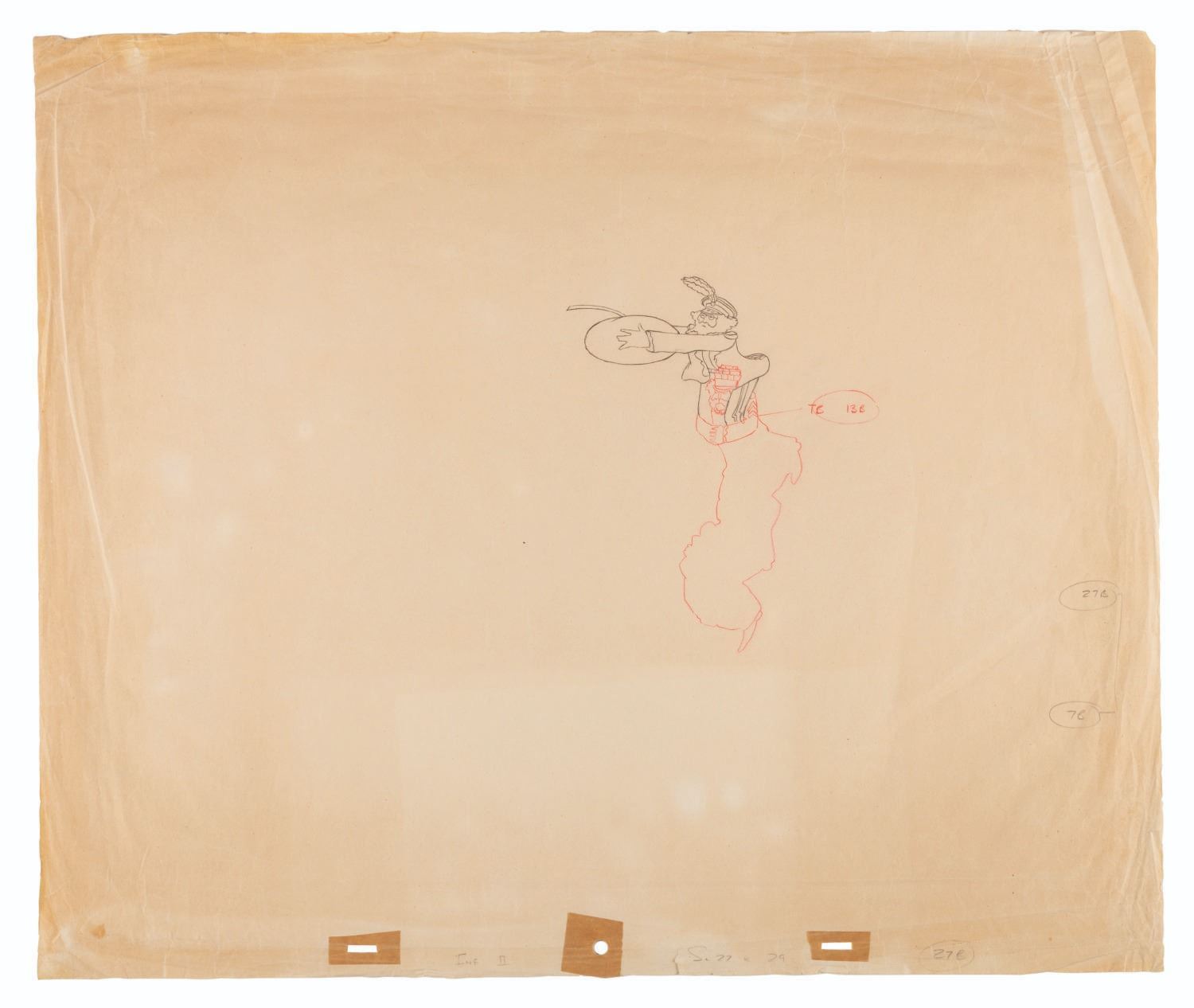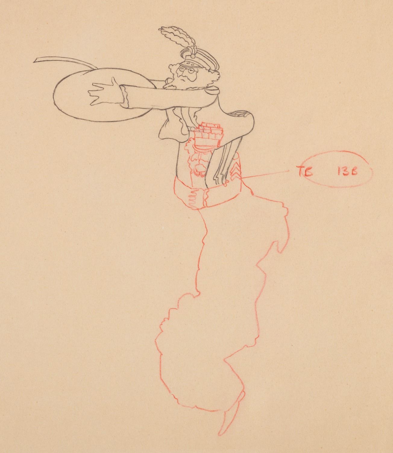 (United Artists, 1968) An original production drawing of John Lennon on Paul McCartney’s shoulders from The Beatles animated film "Yellow Submarine.” Accomplished in graphite and color pencil with a character image size of 4” x 6.25” on 16” x 18.75” animation paper, the drawing is in good condition with heavy discoloration, creases, edge wear, and pencil notations from production use.