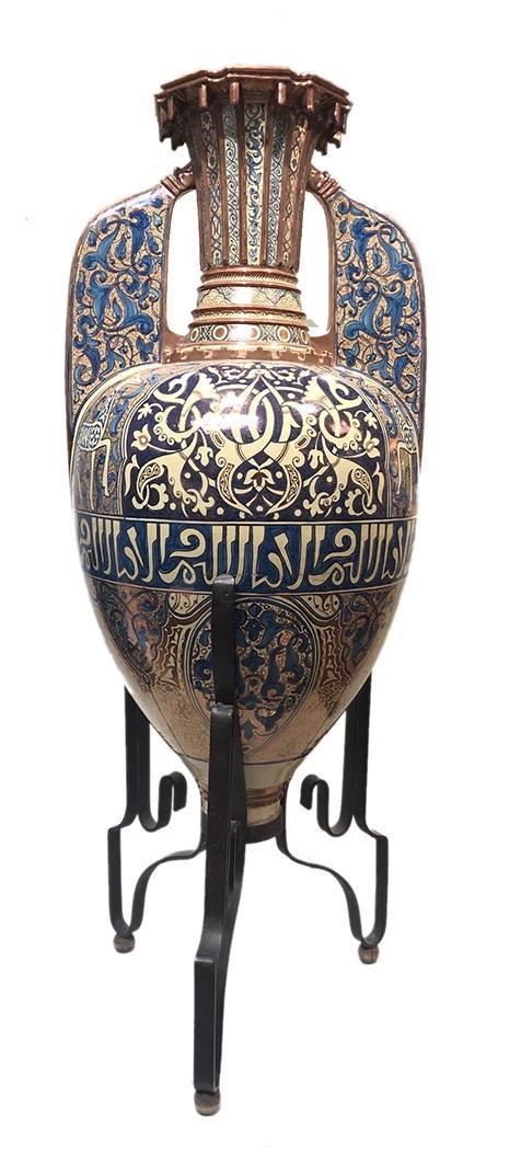 A monumental Hispano-Moresque pottery 'Alhambra-style' vase, Spain, late 19th century. Size of Vase 41 inches high x 20 inches diameter + stand. of tall baluster form, bown, blue and cream glazes, decorated with inscriptions to handles and center with Animals and floral design. Very Attractive vase. Custom mounted on Iron stand.