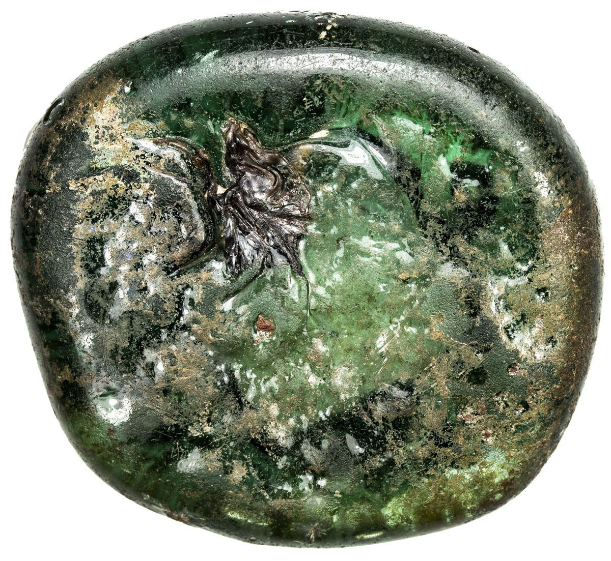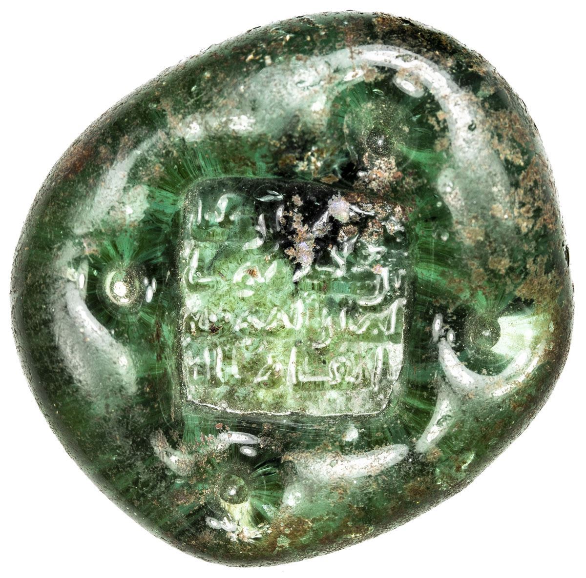 ABBASID: glass disk weight (31.41g), A-338U, B-675, 46mm, weight for one wuqiya, in the name of the governor of Egypt, 'Ali b. Yahya (al-Armani), 840-843 & 848-849, with the legend in a square (al-amir 'ali / bin yahya mawlà / amir al-mu 'minin / abqâhu Allah), with 4 incuse points around the square center, translucent green, EF, RRR. Balog knew of just one example, which he described as "unpublished", whence this is likely the second known example. The last phrase of the legend means "may God preserve him".