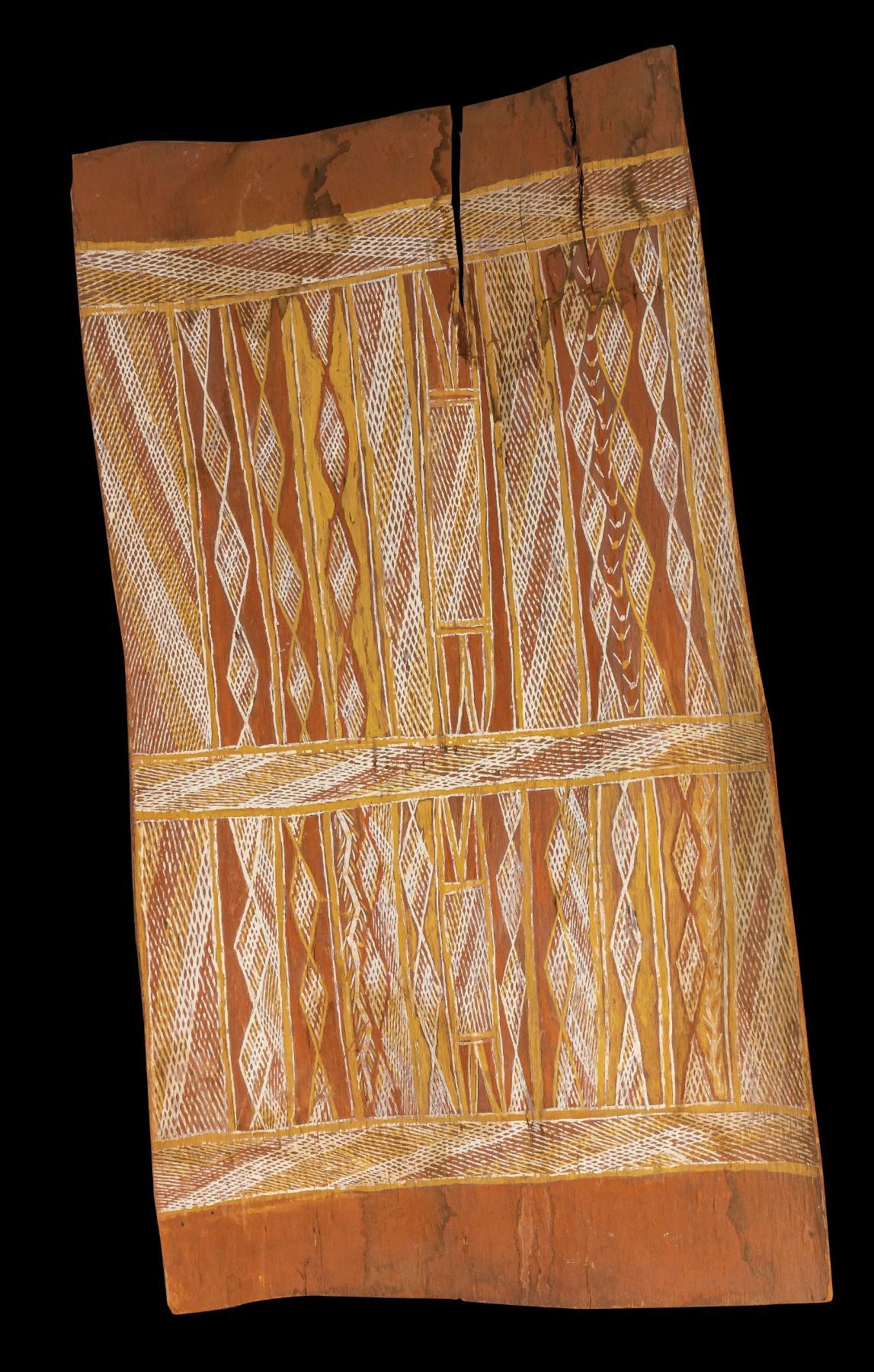(Mid-20th Century) Arnhem Land painting with natural ocher pigments in geometric patterns. Some water staining and separations. Unknown Artist. Rare. 26"x14" VG+.