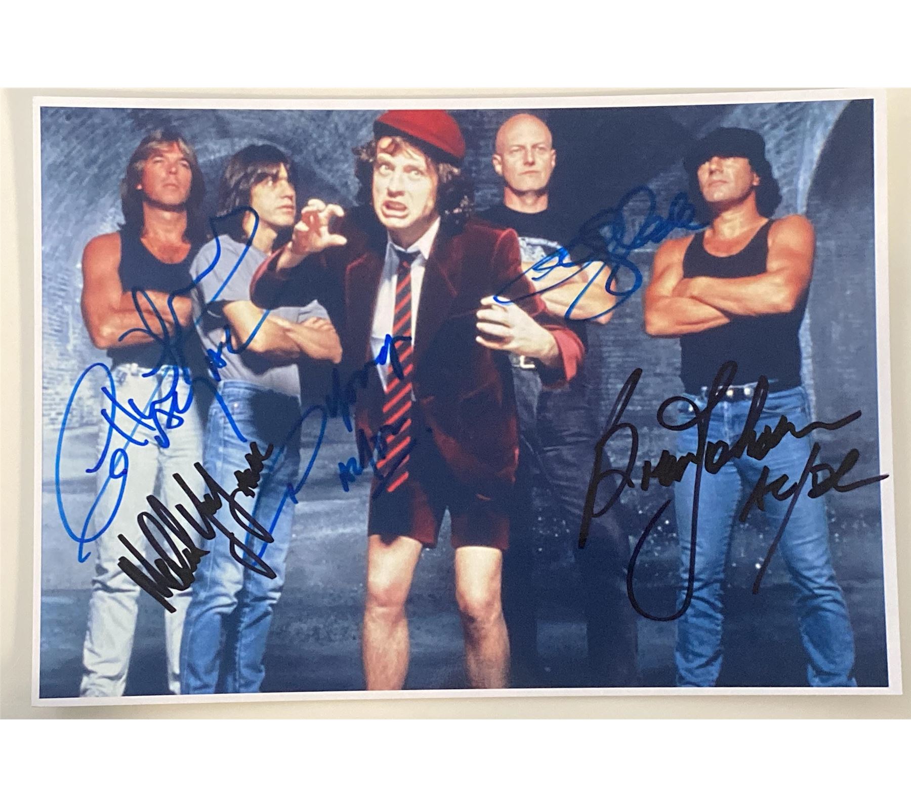 AC/DC signed photo autographed by Chris Slade, Angus Young, Malcolm Young, Cliff Williams, and Brian Johnson. 9x12 inches