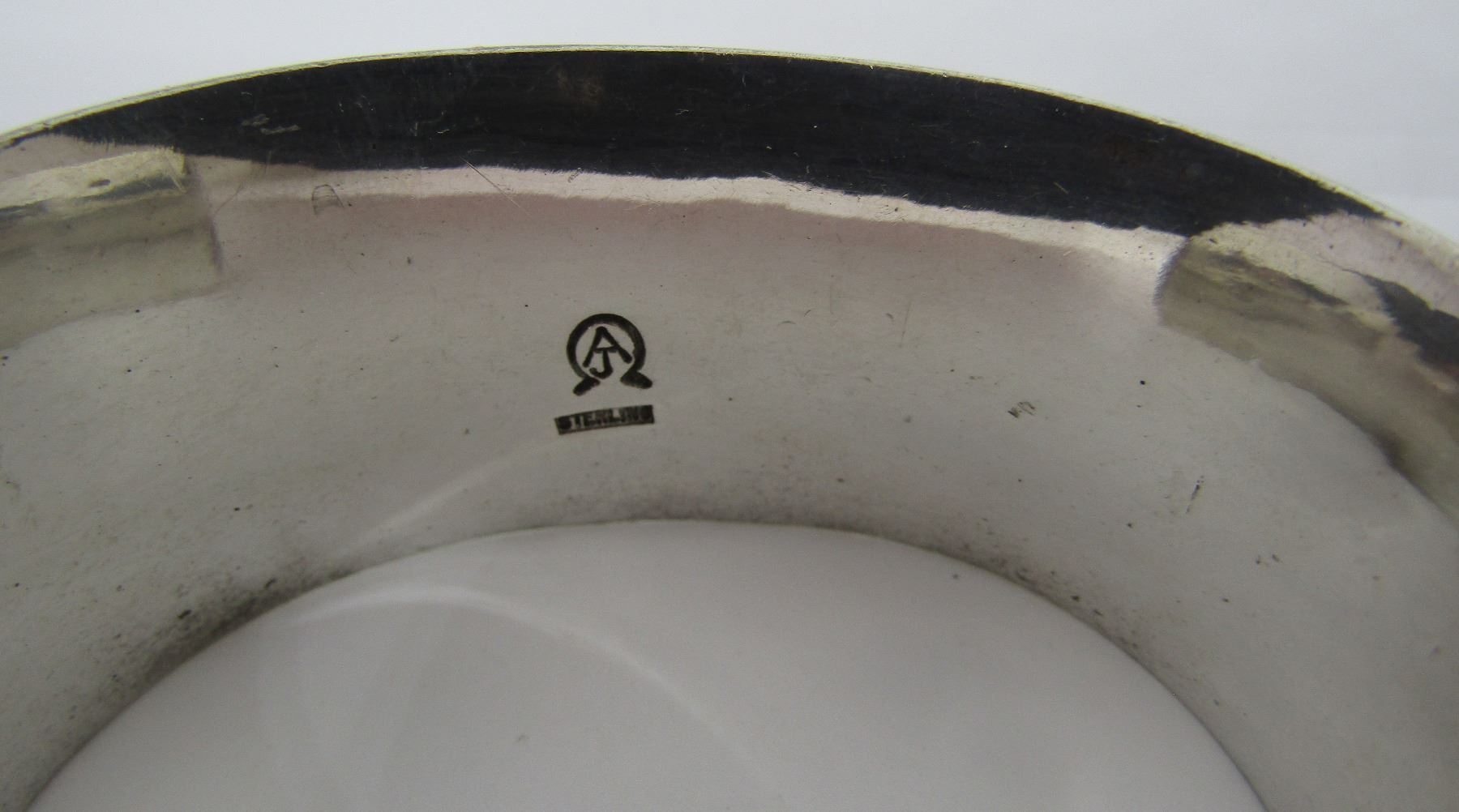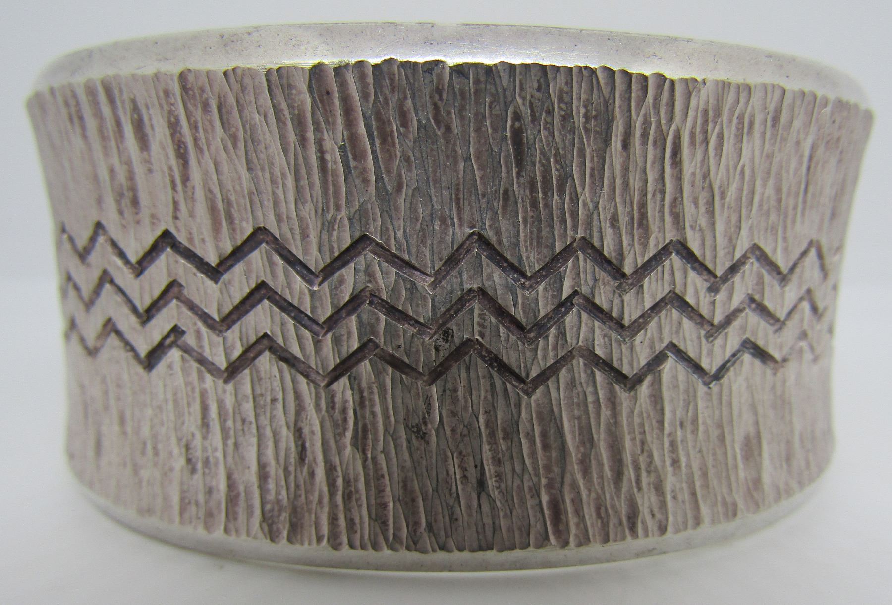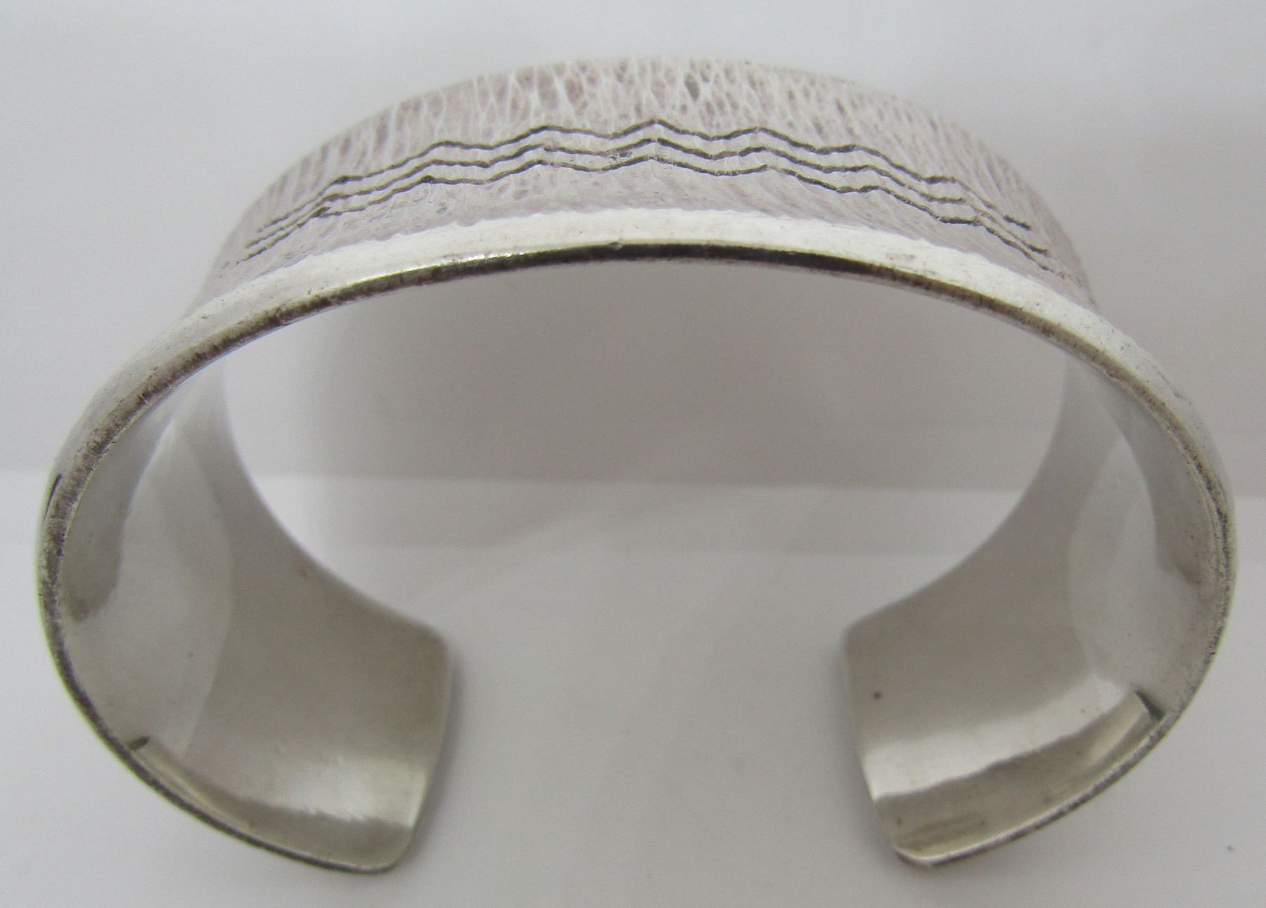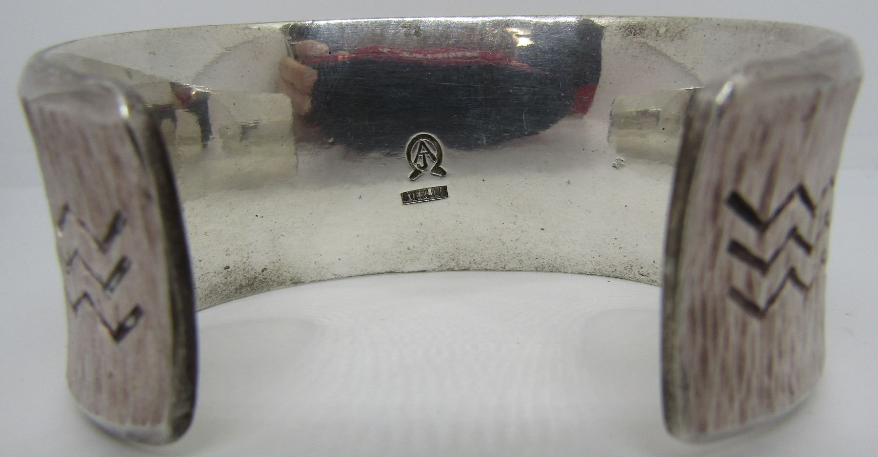 HALLMARKED "AJ STERLING" SILVER. VINTAGE ESTATE NATIVE INDIAN JEWELRY. TOP MEASURES 31MM WIDE. WEIGHS 104.2 GRAMS. INSIDE 6.5"; INCLUDING 1.25" GAP. USA SHIPPING $5.