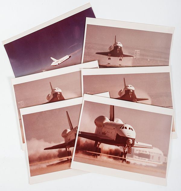 Alt -- 6 Color Photos of the Enterprise. ALT -- Series of 3 color photos of Enterprise just prior to touch down at Rogers Dry Lake runway and 2 more just prior to the nose wheels touching down. Also, a color image of the Enterprise at separation from the 747 as it began one of its "tail cone on" test flights. Ex. the Astronaut Donald K. "Deke" Estate Collection.