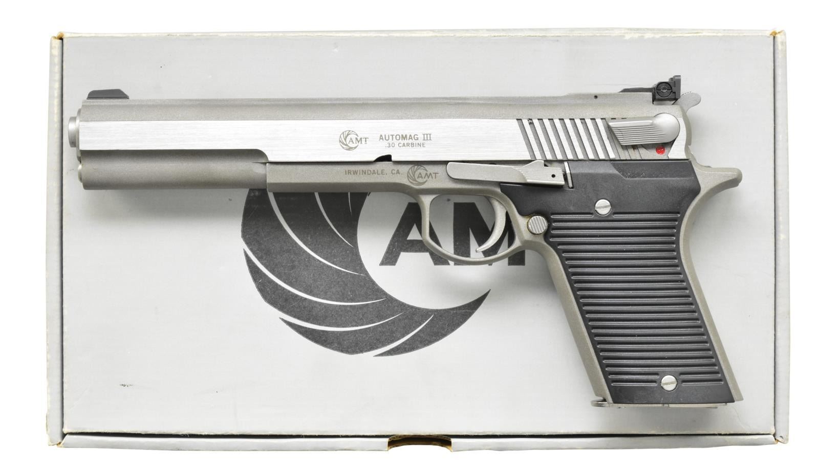 Cal. 30 Carb. S# A08969. Bbl. 6 3/8". Mfg. 1992–2014 w/ all stainless construction & horizontally grooved black Lexan grips. Slide has thumb safety, square cut cocking grooves, milled finish on sides of slide & raised rib having Millett adj. 3 dot sights. Features include squared front of trigger guard, oversized slide release, extended mag. release & full length guide rod. Very good trigger pull. MAGS: 1 factory stainless 8 rd. UNATTACHED ACCESSORIES: very good original box & packaging. CONDITION: all aspects near excellent including bore; appears unfired. (20-1525/NW). MODERN. $900-1,400.