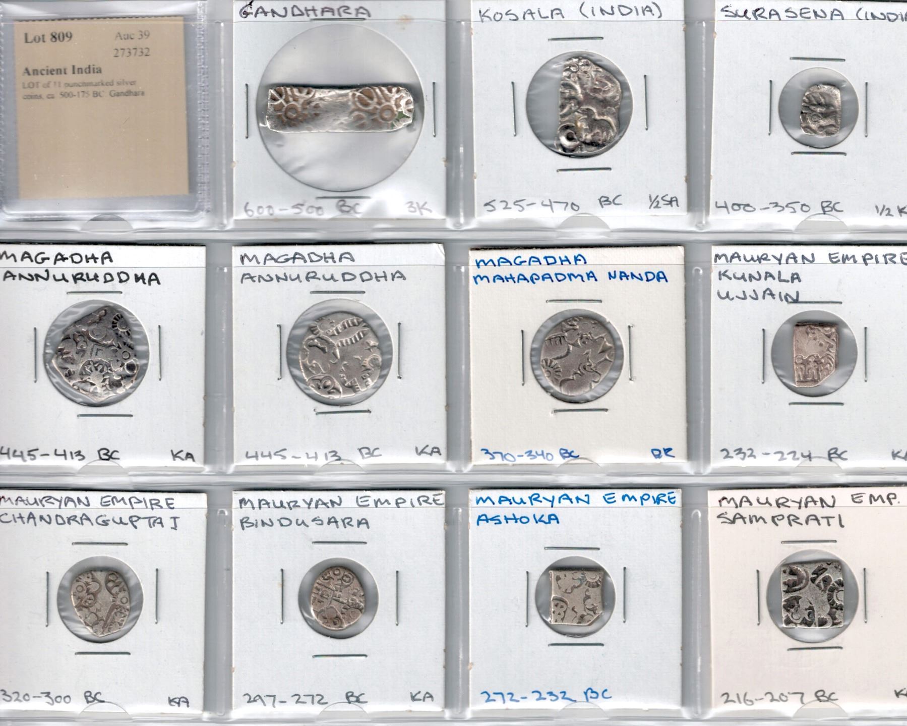 ANCIENT INDIA:LOT of 11 punchmarked silver coins, ca. 500-175 BC: Gandhara "bent bar", long variety (VF); Kosala karshapana, many reverse marks (VF-EF); Shurasena small size (VF); Magadha (3, average VF); and Mauryan Empire (5, including one with the three-figure stamp, average F-VF); all in holders identified by the consignor; retail value $450, lot of 11 pieces.