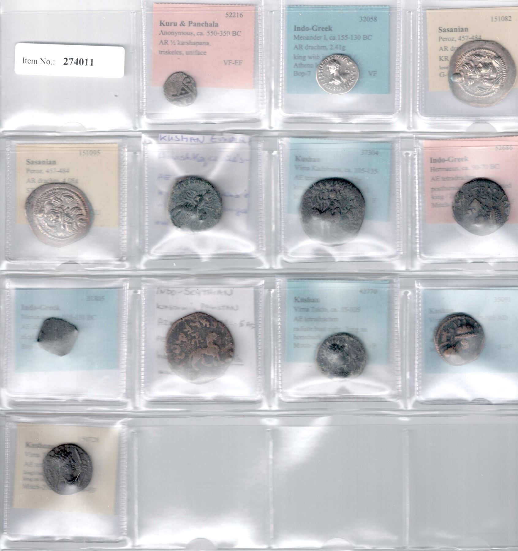 ANCIENT INDIA:LOT of 4 silver and 8 copper coins: Silver: Kuru & Panchala ½ karshapana; Indo-Greek, Menander, drachm; and Sasanian, Peroz, drachm, KR (Kirman) and ST (Istakhr) (both choice EF); and Copper: Indo-Greek, Menander I, chalkon, and Hermaeus, posthumous tetradrachm; Indo-Scythian, Azes II, hexachalkon; Kushan, Vima Takto, tetradrachm (3, various subtypes, one nearly EF); Vima Kadphises, tetradrachm; and Huvishka, tetradrachm with Mao; all with full description (mostly from our previous pricelists), average circulated grades, many very attractive; retail value $575, lot of 12 pieces, ex Fuller Collection.