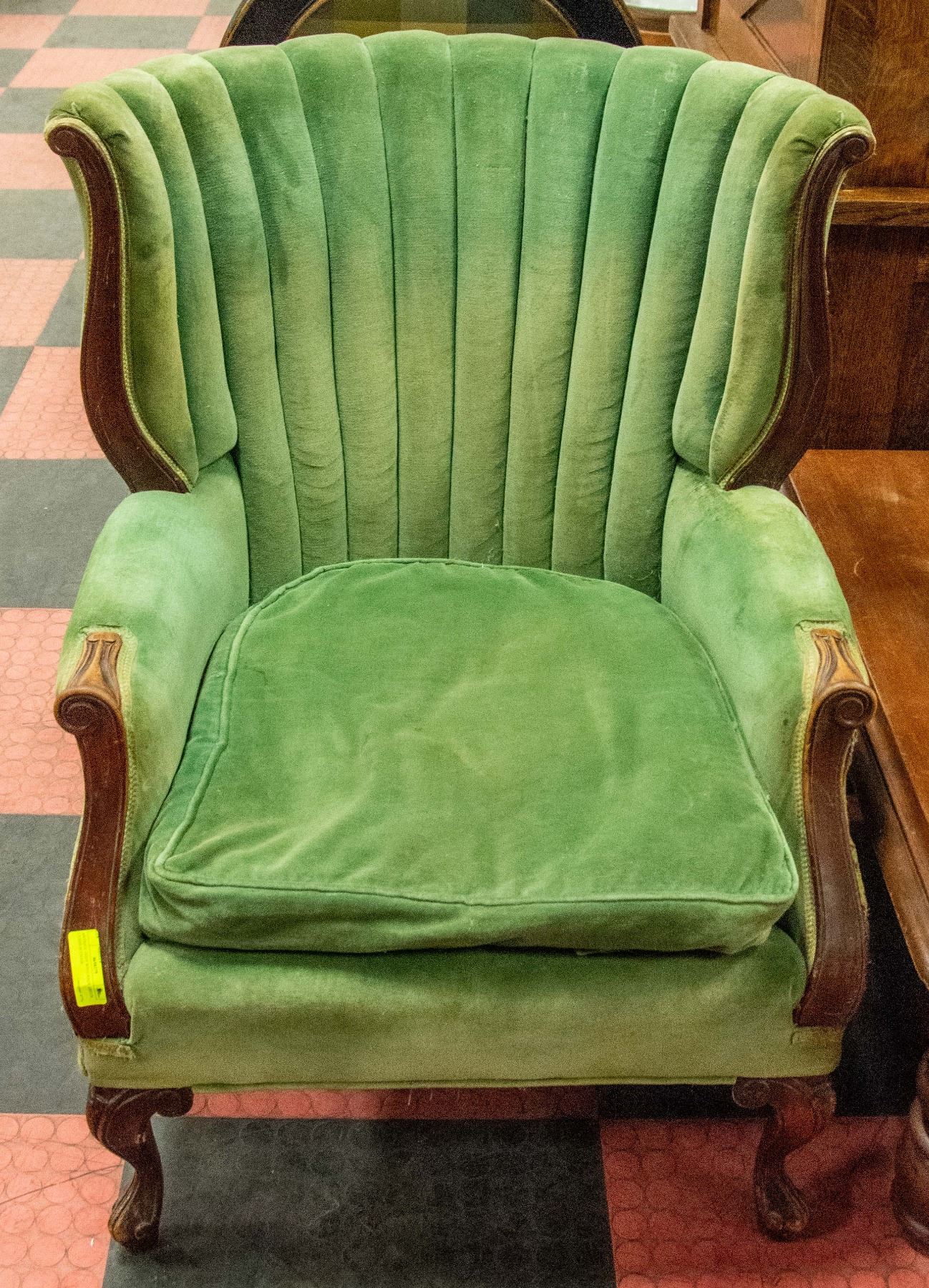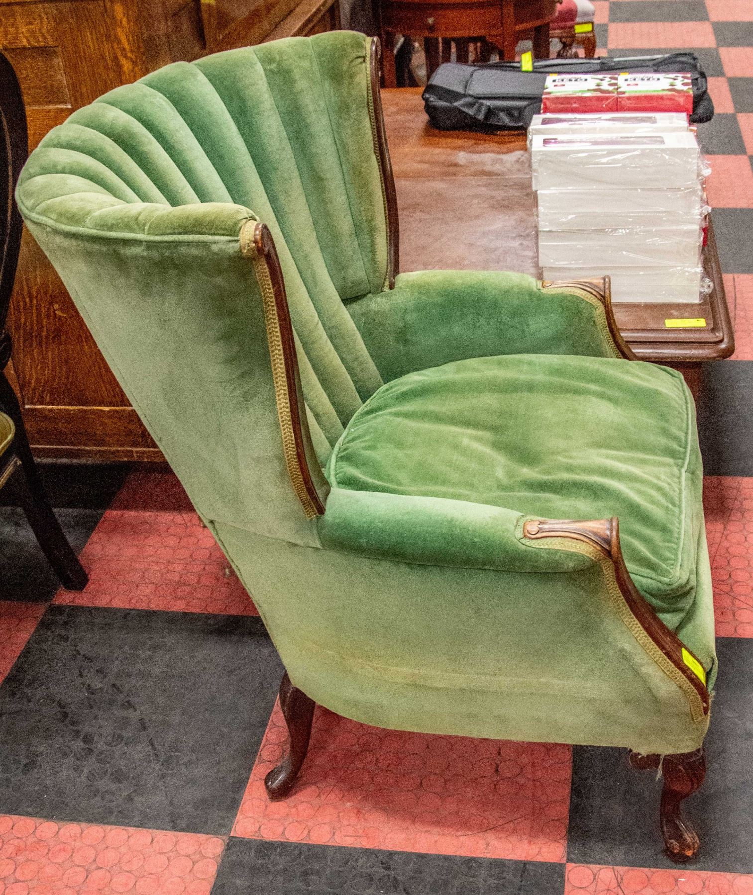 ANTIQUE 1920'S WING BACK GREEN CUSHION CHAIR