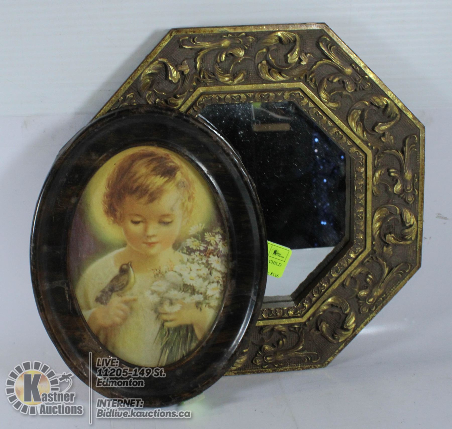 ANTIQUE OCTAGON MIRROR, CHILD METAL FRAME PICTURE