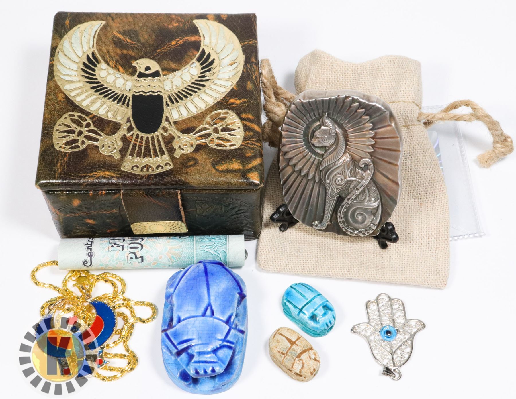 SILVER. ANTIQUED (ANTIQUED COINS ARE BARE HAND FRIENDLY). COMES WITH EASEL, HEMP DRAWSTRING LINEN BAG, BEAUTIFUL LEATHER JEWELRY BOX, ONE LARGE TWO SMALL HAND CARVED LUCK SCARABS, TWO PC OF JEWELRY, GRAPHIC BANK NOTE. ACCESSORIES ALL MADE IN EGYPT.***ITEM(S) LOCATED IN LETHBRIDGE ALBERTA, FREE TRANSPORT TO EDMONTON OFFICE IS AVAILABLE FOR THIS AUCTION