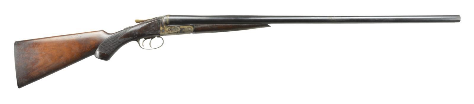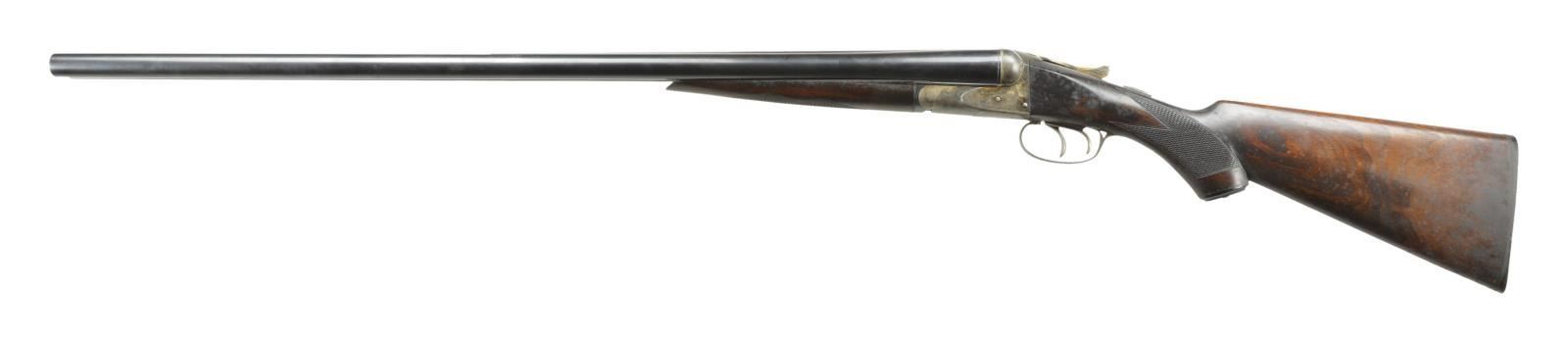 Cal. 12 Ga., 2 5/8". S# 86164. The 30" bbls. w/ concave matted rib has Sterlingworth steel & A.H. Fox Philadelphia address markings on tops. Serial number is on bbl. flats. Boxlock type action w/ fox rotary bolt is marked "Sterlingworth" on each side w/ in zig zag & line borders. Action features automatic safety & double triggers. Serial number is on blued trigger guard tang. Capped pistol grip buttstock of plain American walnut measures 14 1/8" over a serrated hard rubber buttplate. Point pattern checkering is at grip. Matching splinter forend has friction release. MEASUREMENTS: BBLS.: Bore Diameter: R: .736", L: .737". Restrictions: R: .036 (EXTRA FULL), L: .038" (EXTRA FULL). Minimum Wall Thickness: R: .021", L: .049". STOCK: DAH: 2 11/16". DAC: 1 9/16". CAST: neutral. LOP: 14 1/8". WEIGHT: 7 lbs. 9 oz. CONDITION: exceptionally fine but very dirty. Bbls. retaining approx. 90% original blue with scattered marks. Action retains over 90% original casehardening color without noted problems except for masking by congealed oil. Stocks retain nearly all of their original oil finish, also quite dirty. Bores are bright & shiny. Mechanically fine. (22-1235/MGM). CURIO. $400-600.