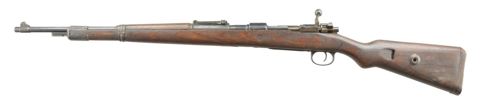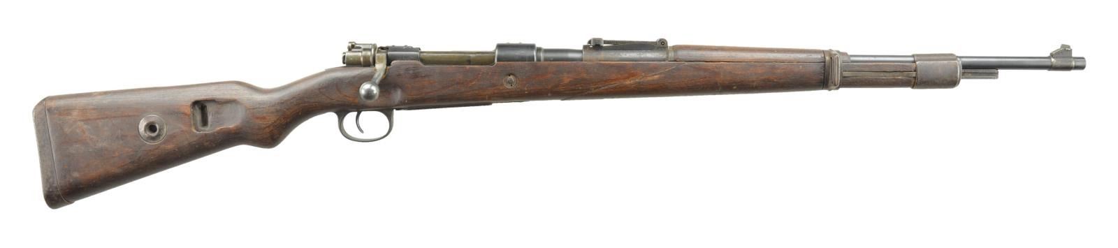 Cal. 7.92x57mm (8mm Mauser). S# 9490 L. Bbl. 23 3/4" w/ blade front sight & 2,000m tangent rear sight. Eagle "135" proofs on receiver ring indicate Mauser mfg.; receiver ring markings have been removed, drilled & tapped along w/ rear receiver bridge. Bbl. marked "D852" in front of receiver ring. Bolt handle has been cut, altered & reattached. Mismatched numbers throughout. "byf" stamped floorplate. Laminated wood stock set w/ takedown hole, cup type buttplate & eagle "H" proof on left side. CONDITION: very good refinished bbl. & receiver. Fair front sight band, bbl. bands, rear sight base, bolt assembly & buttplate w/ oxidation & pitting. Stock has repaired duffle cut around rear sight along w/ mortise cut where bolt handle sits. Fair worn wood finish w/ moderate handling marks. Good bore w/ strong rifling. PROVENANCE: Estate Collection of Jack Verret Sr. (22-800/MD). MODERN. $200-300.