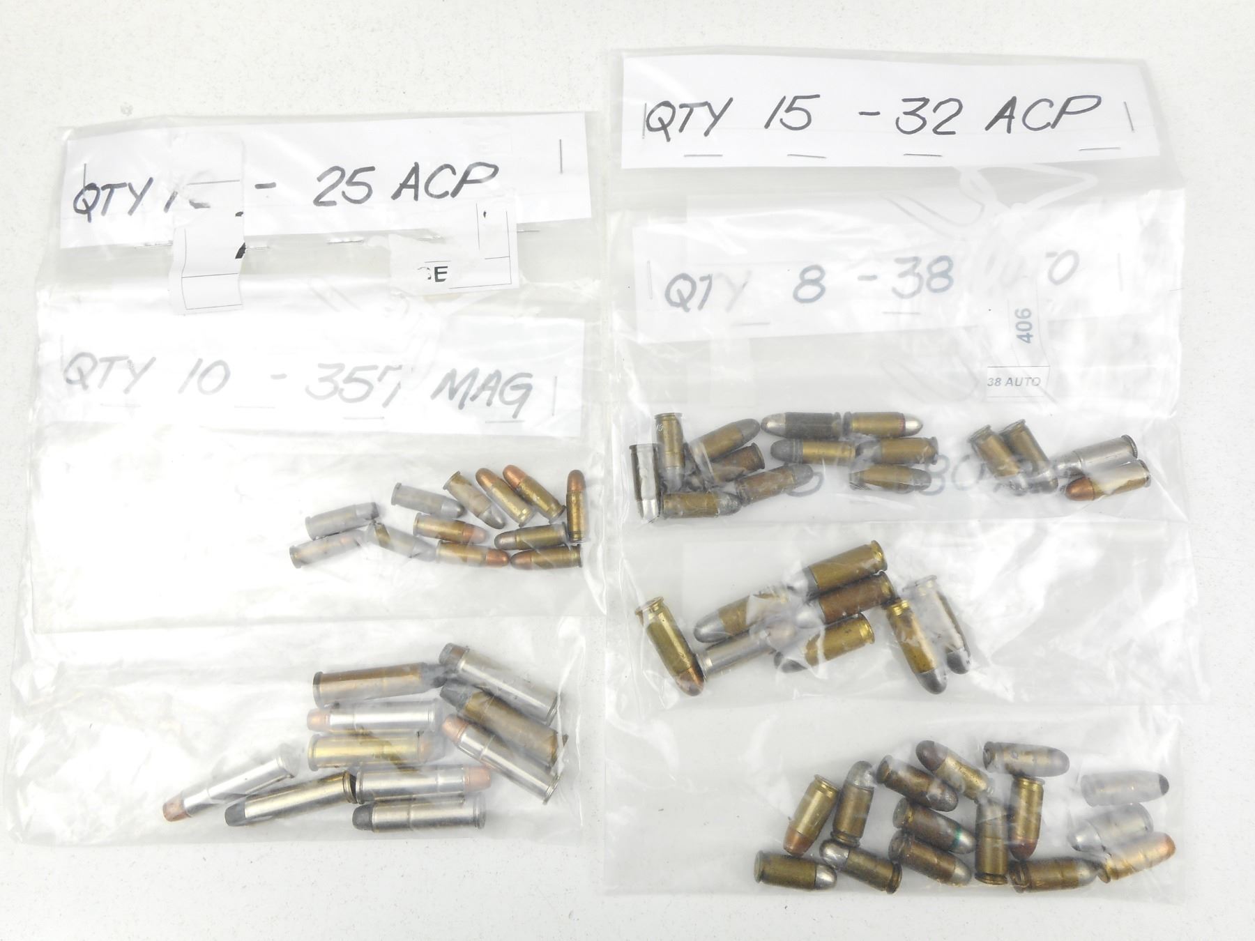 ASSORTED AMMO, 32 ACP, 380 AUTO, 25 ACP, 38 AUTO, 357 MAG. AMMO , 60 RNDS TOTAL, 15 RNDS 32 ACP, 8 RNDS 38 AUTO, 12 RNDS 25 ACP, 10 RNDS 357 MAG, 15 RNDS 380 AUTO AMMO