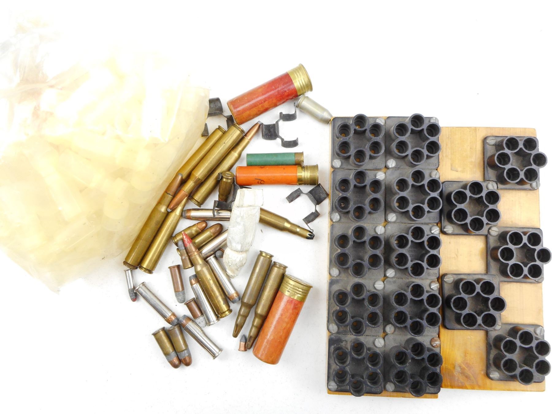 ASSORTED AMMO AND RELOADING , 28 RNDS ASSORTED, INCLUDES 10 GAUGE, 30-06, 357 MAG, 30 LUGER, LOADING BLOCKS AND WADDING