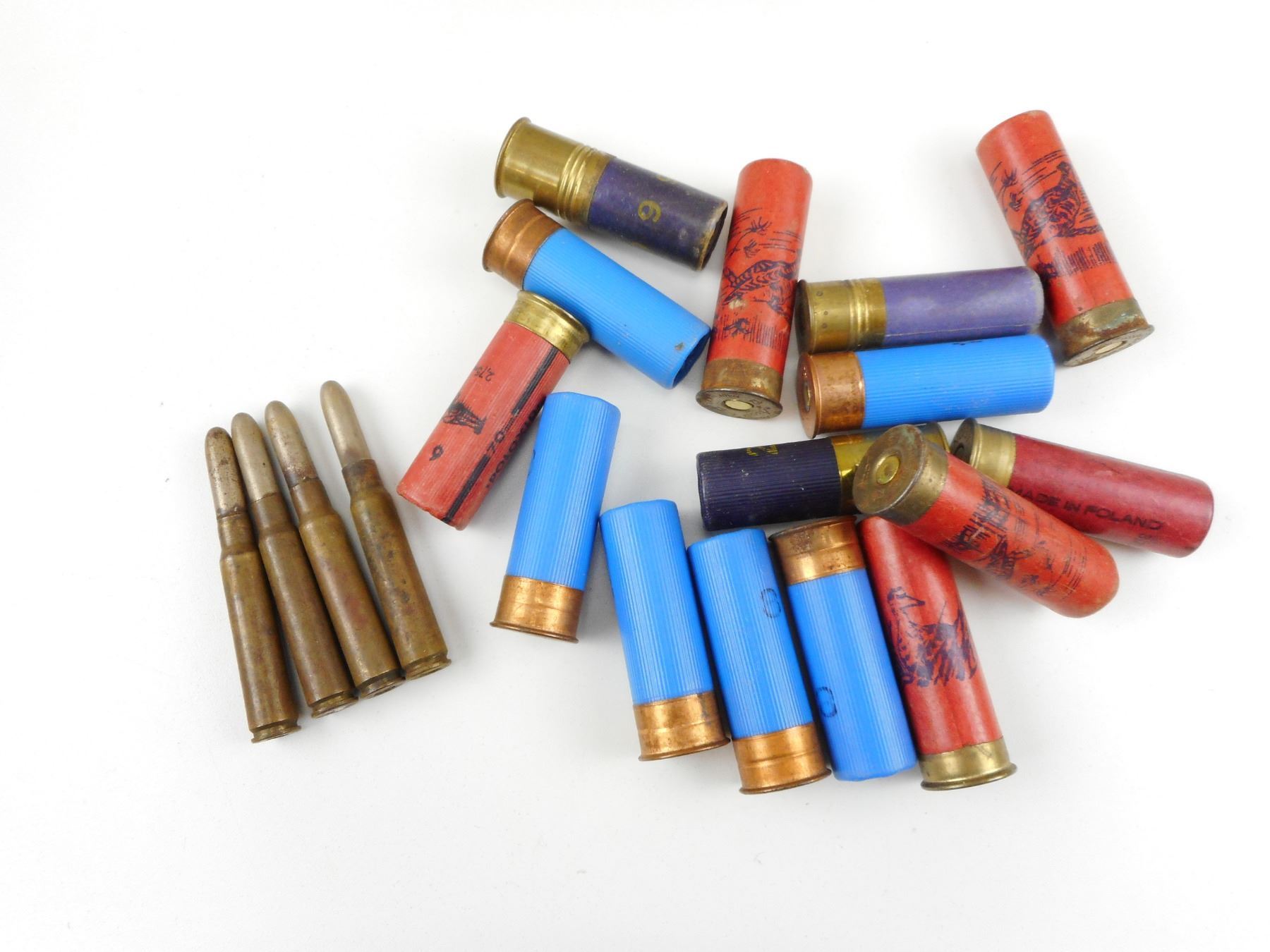 ASSORTED AMMO LOT, 4 RNDS OF 6.5 X 54R AMMO, 15 RNDS 12 GA. ASSORTED SHOTGUN SHELLS