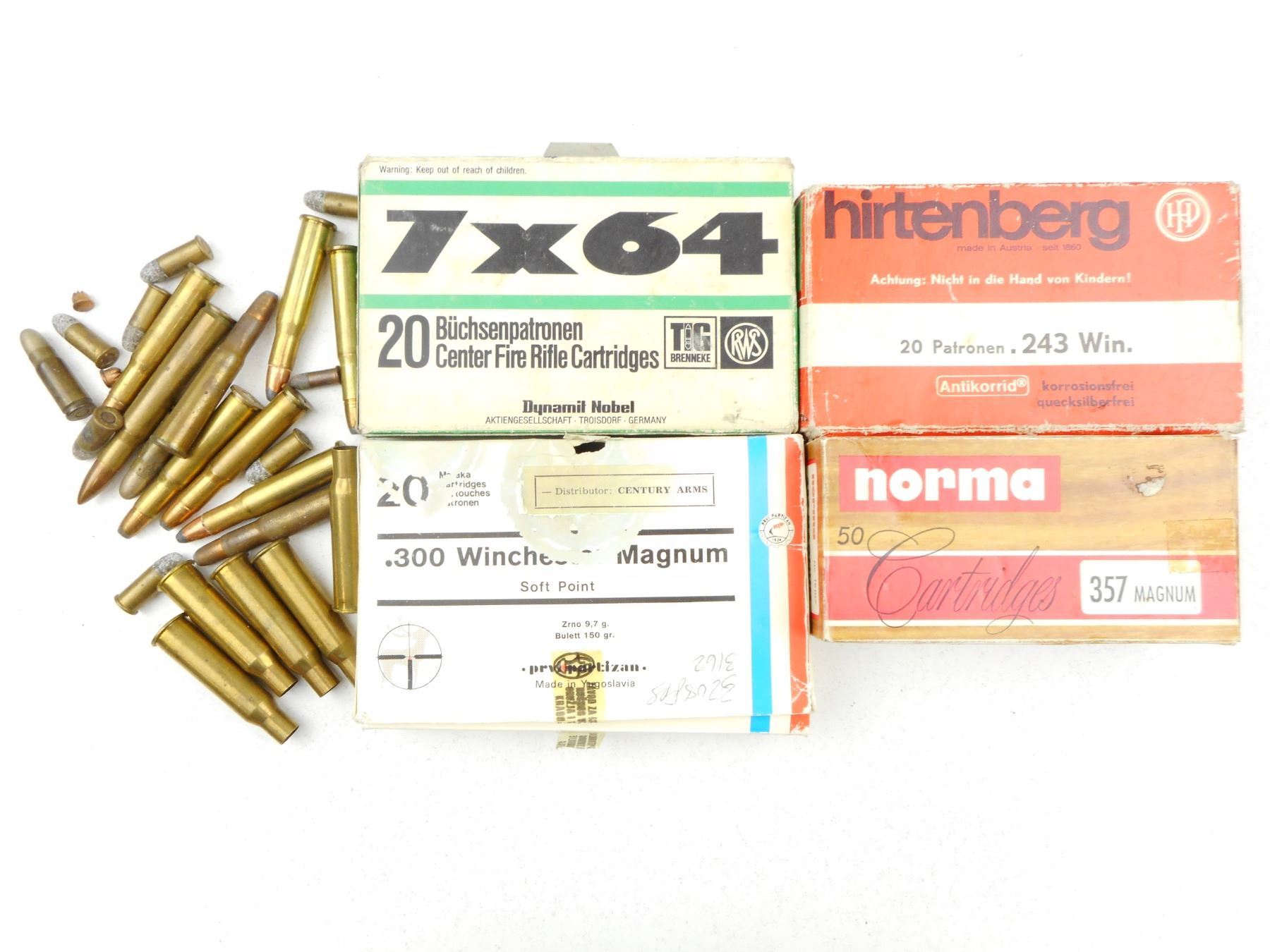 ASSORTED AMMO , 69 RNDS INCLUDES PRVI PARTIZAN, 300 WIN MAG, 30-30, HIRTENBERG 243 WIN, RWS 7X64. 357 MAG, AND 7.62X54R PRIMED BRASS