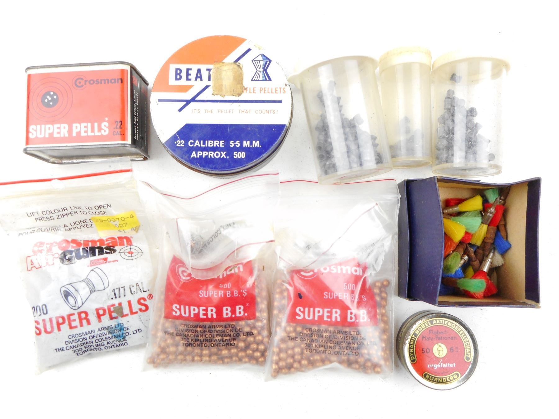 ASSORTED BB'S, PELLETS AND DARTS AMMO , APPROX. 1000 SUPER BB'S, APPROX. 100 .22 PELLETS, AN D 250 SUPER PELLS, 11 FLOBERTS 6MM