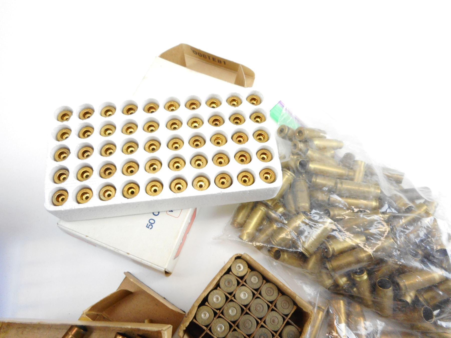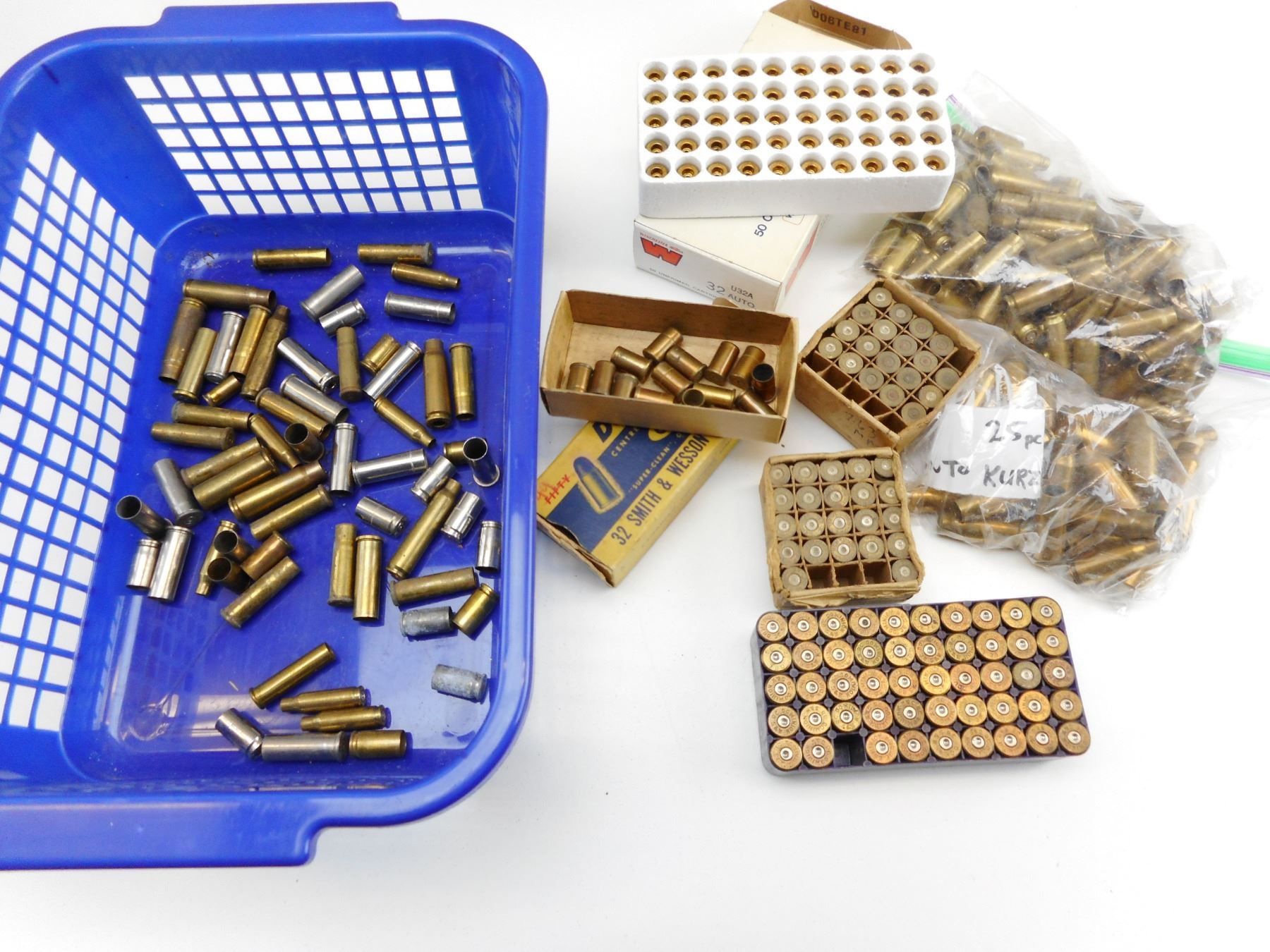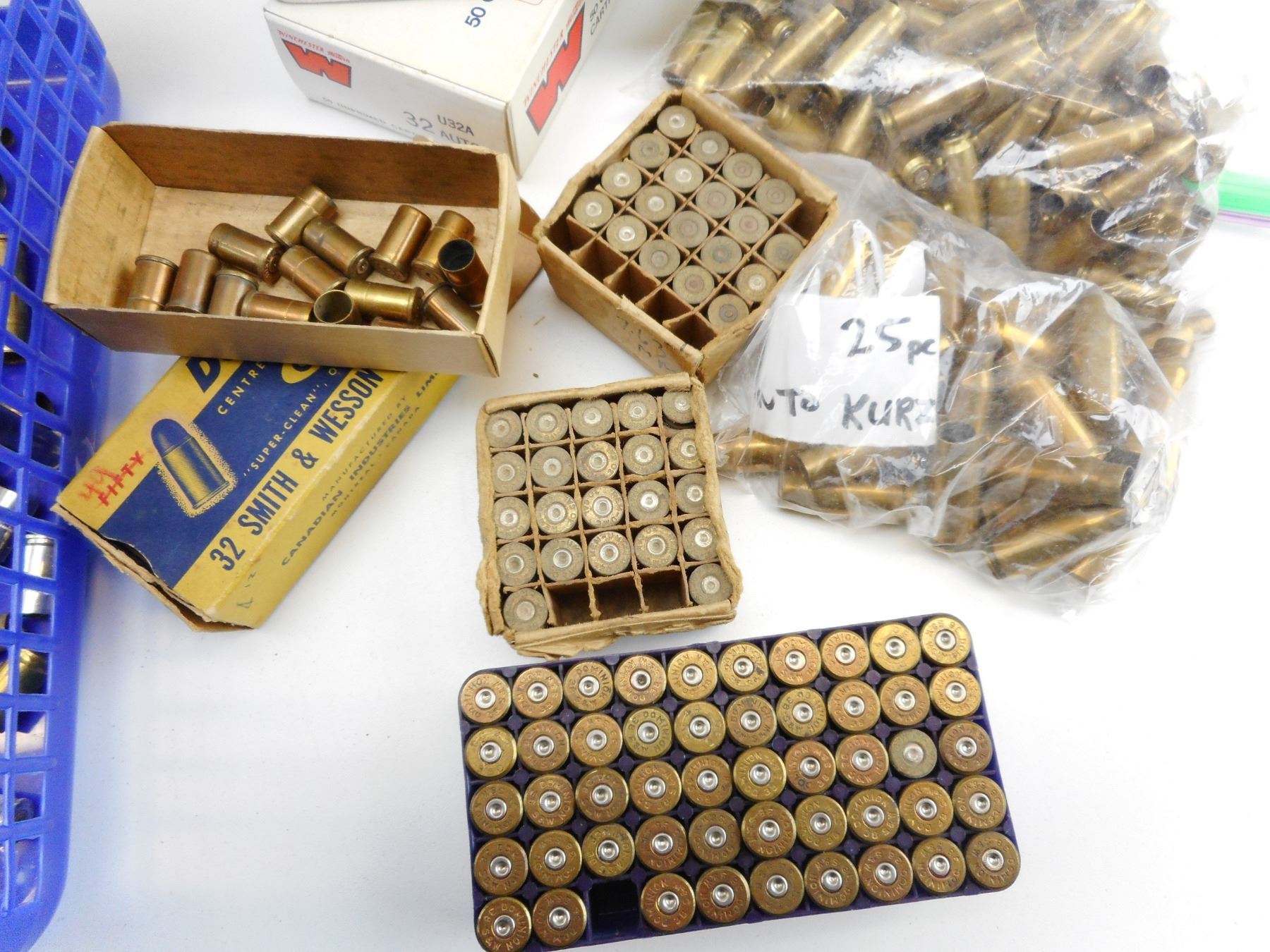 ASSORTED BRASS , 1.6KG BAG OF ASSORTED BRASS, INCLUDING 32 AUTO, .38 S & W, 32*20 CAL, 38 SP, INCLUDING VINTAGE DOMINION 32 S & W BOX