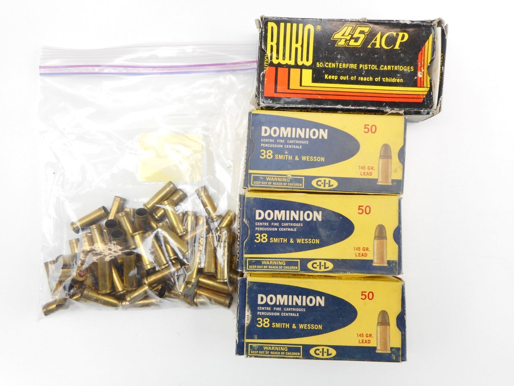 ASSORTED BRASS , 1.3 KG ASSORTED BRASS, INCLUDING 38 SMITH & WESSON, 45 ACP, 38 SP, 38 S & W IN VINTAGE DOMINION BOXES