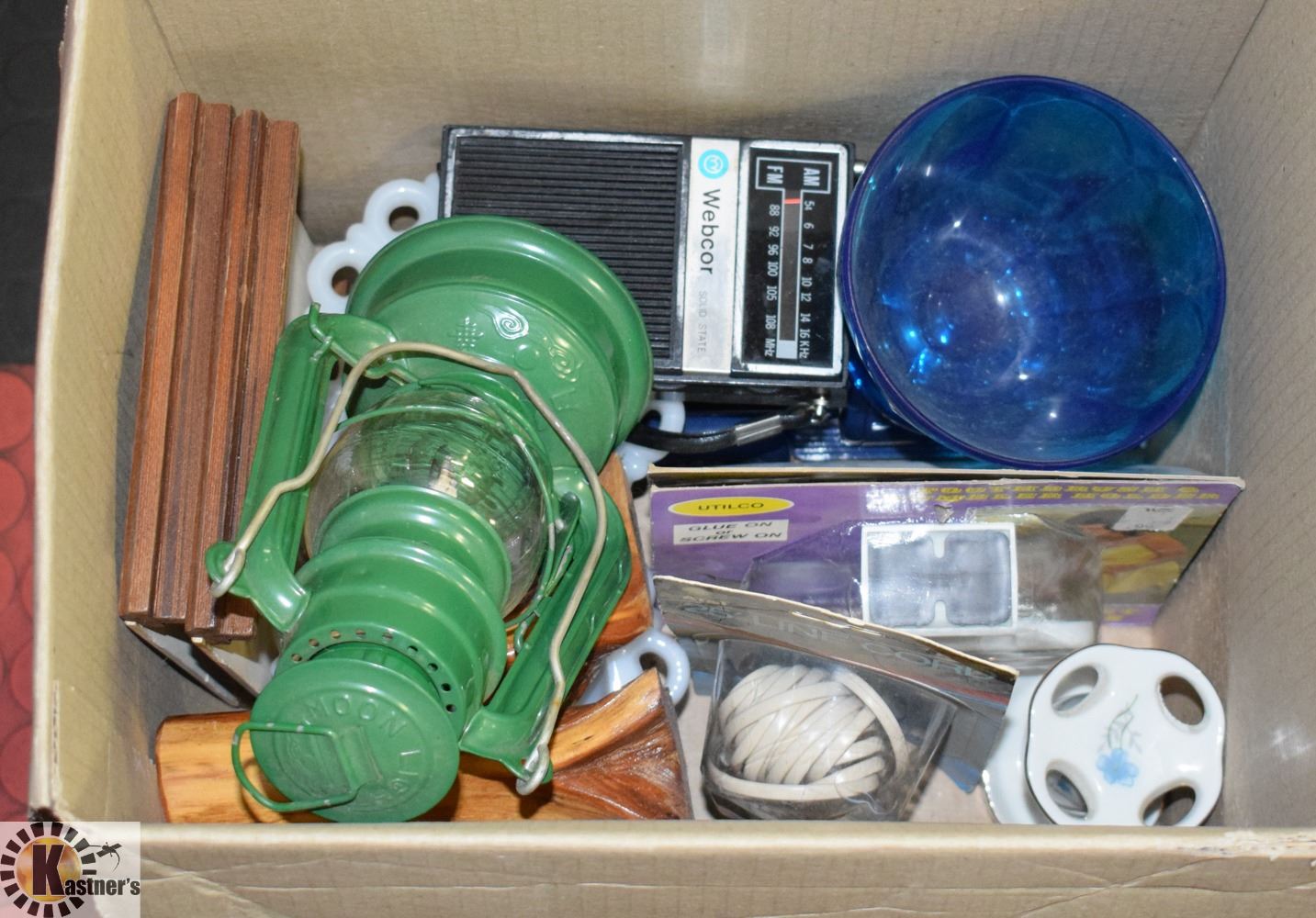 WEBCOM AM/FM RADIO, WOOLCREST ITEMS IN ORIGINAL PACKAGING, PORCELAIN TOOTHBRUSH HOLDER, WHITE GLASS CANDY DISHES, DIECAST FORD TRUCK & MORE