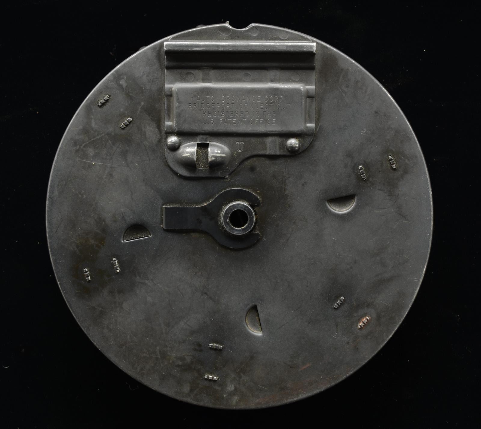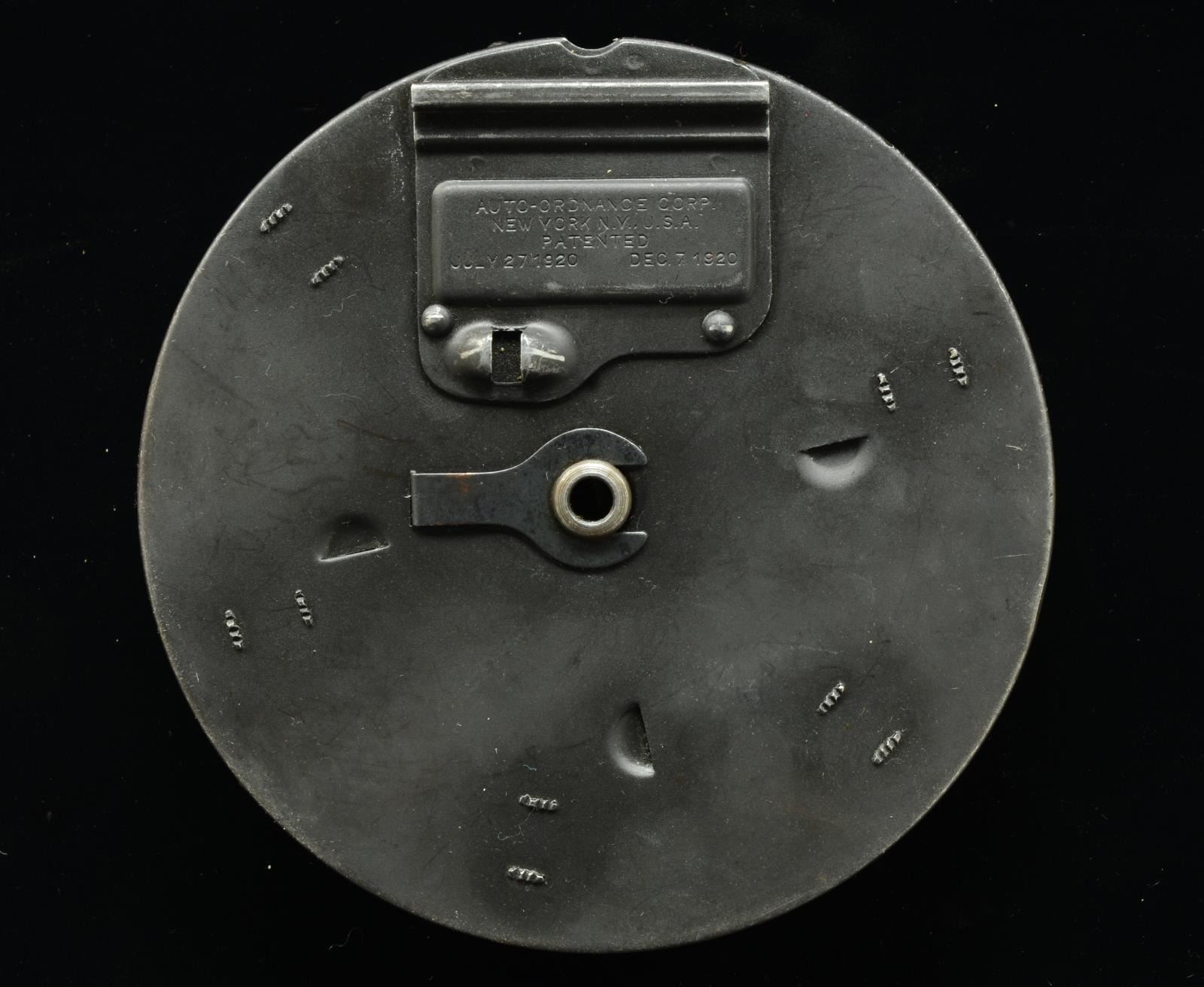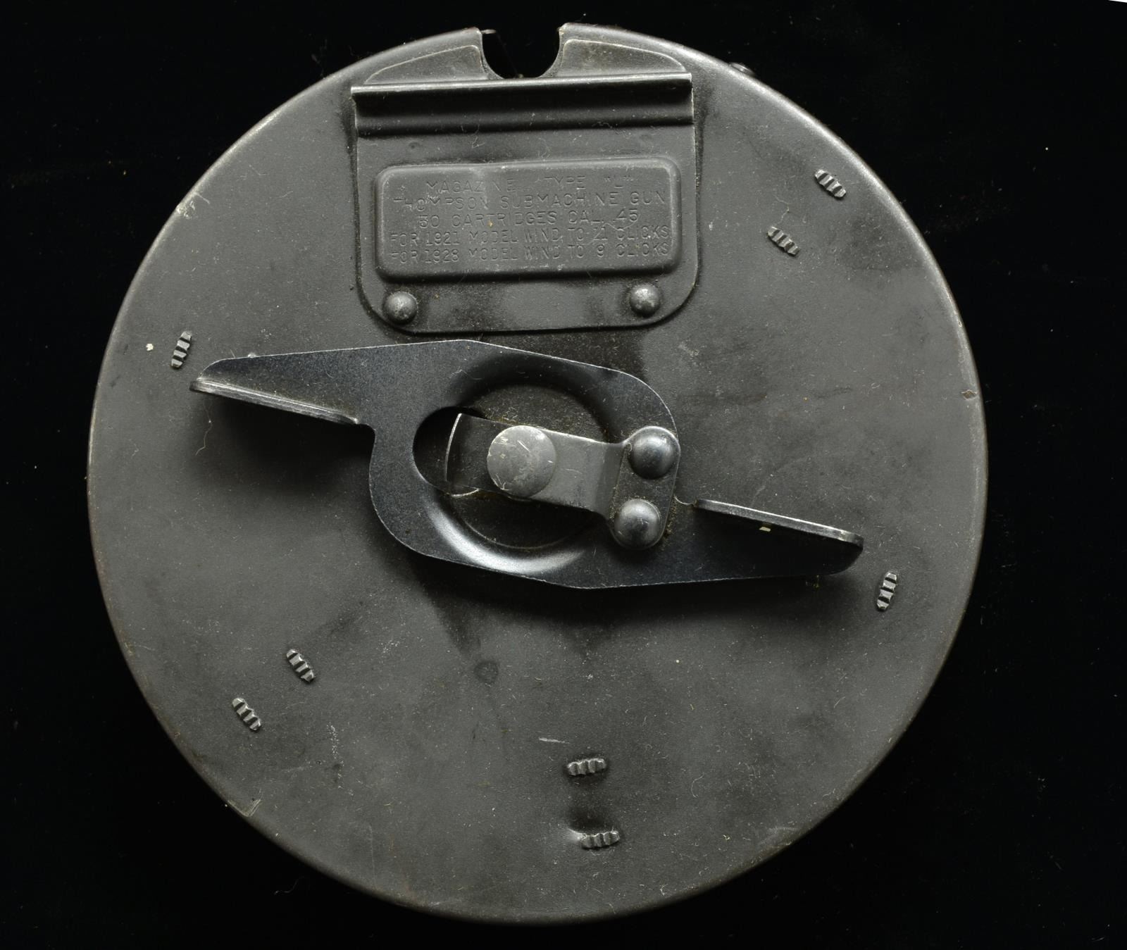 1) Matte finish front data plate marked “MAGAZINE TYPE L. THOMPSON SUBMACHINE GUN. 50 CARTRIDGES CAL. 45. FOR 1928 MODEL WIND TO 9 OR 11 CLICKS.” Marked below data plate w/ dbl. lined letter “U”. Front face plate marked w/ Thompson bullet logo & "WIND TO 9 OR 11 CLICKS”. Rear data plate marked “AUTO-ORDNANCE CORP. BRIDGEPORT, CONNECTICUT. REGISTERED IN THE U.S. PATENT OFFICE”. Marked below data plate w/ dbl. lined letter “U”. Inside tan canvas pouch marked w/ bullet logo & MILLS. (02-13613). 2) Blued finish on front cover. Brown finish on rear cover. Front & rear data plates unmarked. Front face plate marked “AUTO-ORDNANCE CORP. WEST HURLEY, NEW YORK, U.S.A.” & Thompson bullet logo. CONDITION: no major dents that would appear outwardly to influence function. Drum #2 has a very light dent in the front data plate, though it doesn’t seem to be deep enough to affect drum function. (02-13614). 3) Parkerized, matte finish. Front data plate marked “MAGAZINE TYPE L. THOMPSON SUBMACHINE GUN. 50 CARTRIDGES CAL. 45. FOR 1921 MODEL WIND TO 11 CLICKS. FOR 1928 MODEL WIND TO 9 CLICKS". Rear data plate marked “AUTO-ORDNANCE CORP. NEW YORK, N.Y., U.S.A. PATENTED. JULY 27, 1920. DEC. 7, 1920". (02-13615/JZ). $900-1,200.