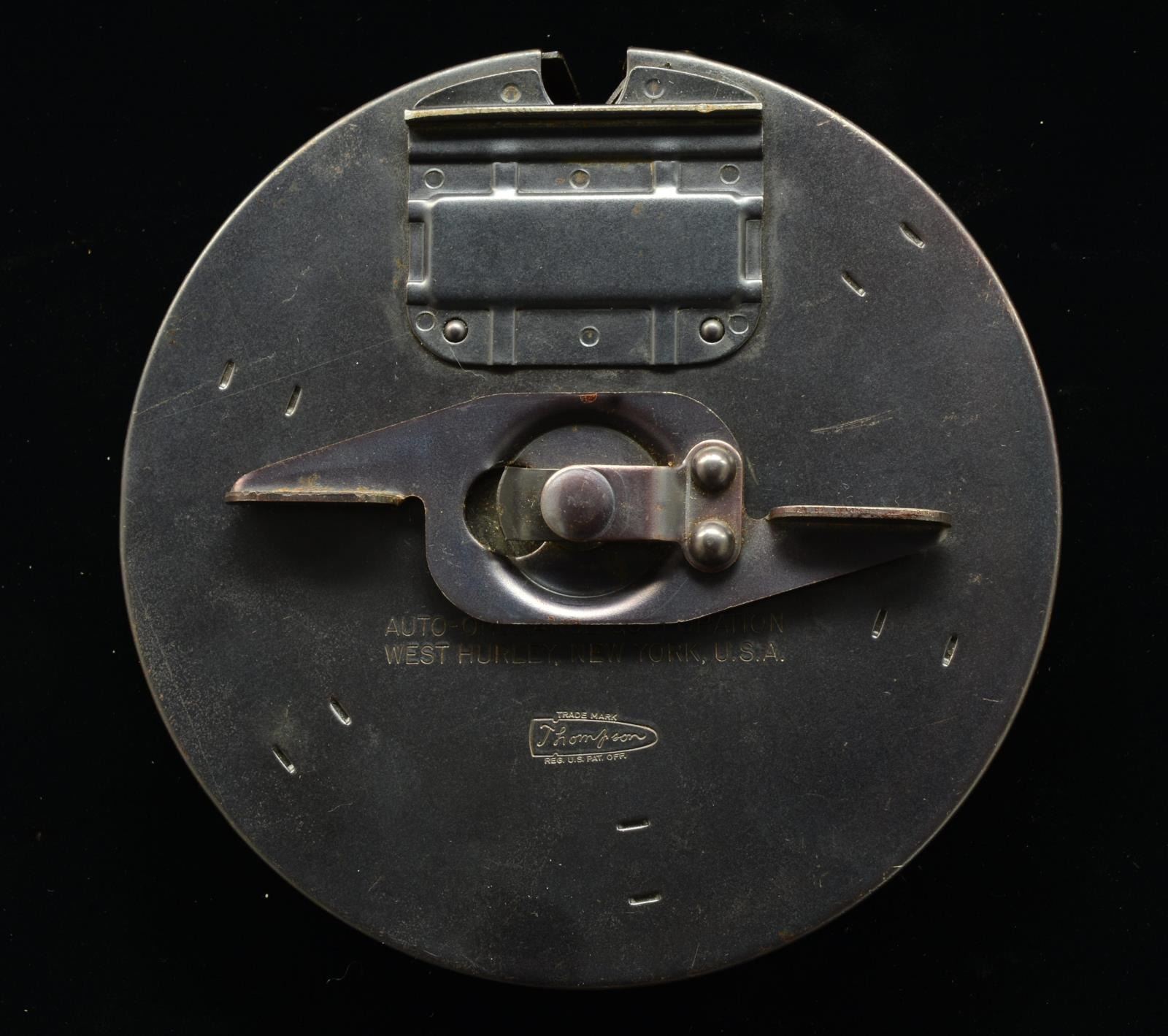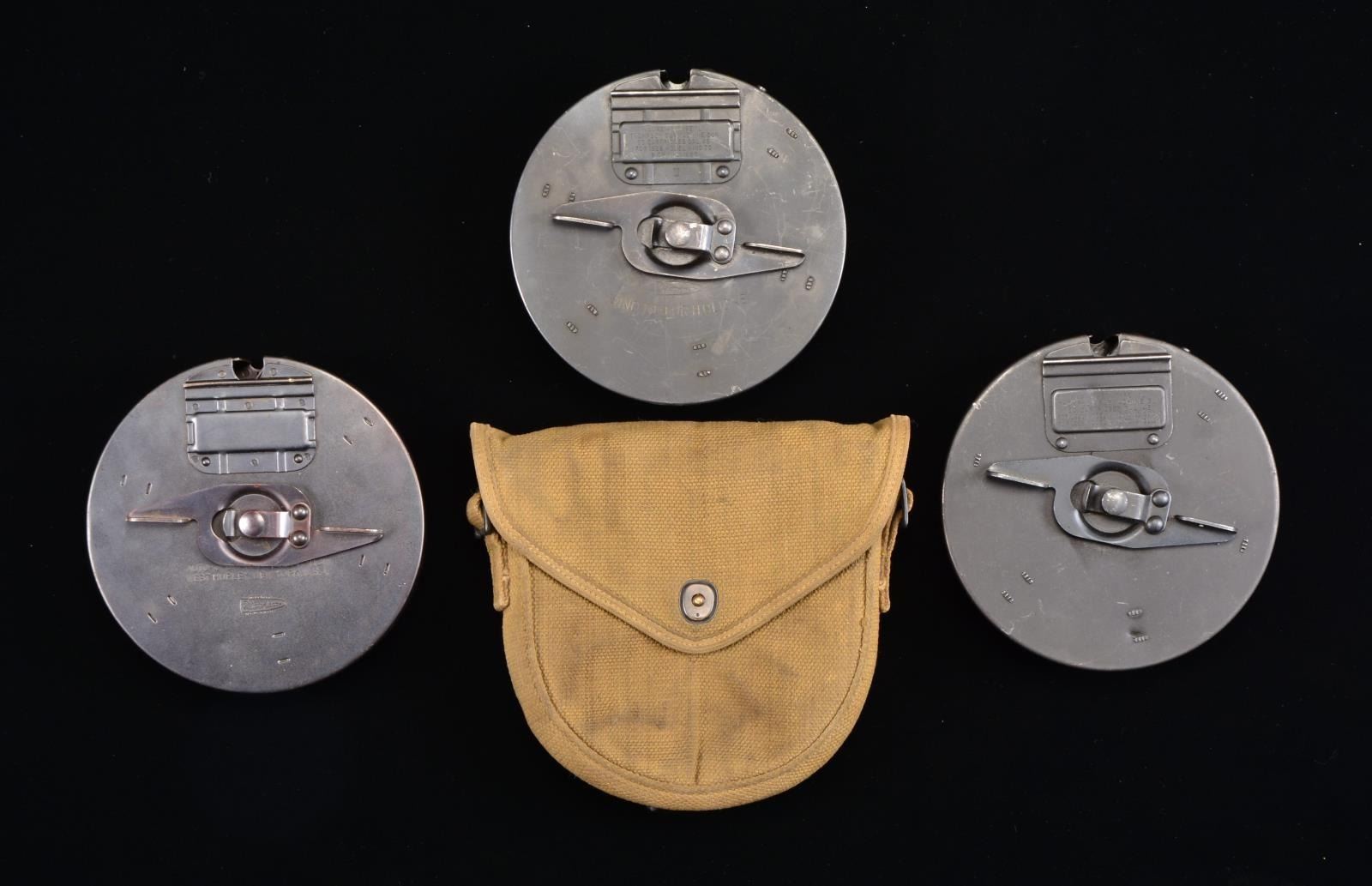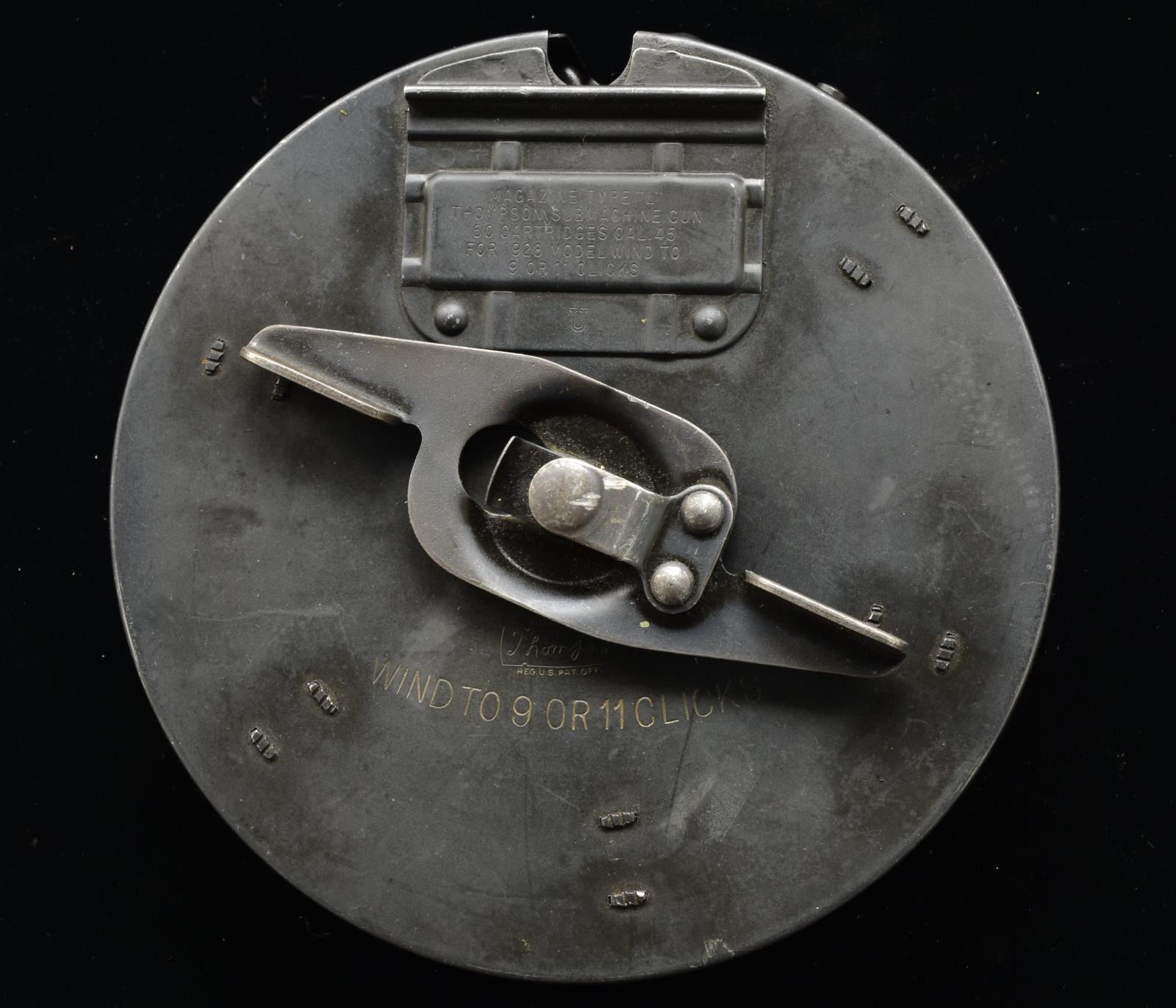 1) Matte finish front data plate marked “MAGAZINE TYPE L. THOMPSON SUBMACHINE GUN. 50 CARTRIDGES CAL. 45. FOR 1928 MODEL WIND TO 9 OR 11 CLICKS.” Marked below data plate w/ dbl. lined letter “U”. Front face plate marked w/ Thompson bullet logo & "WIND TO 9 OR 11 CLICKS”. Rear data plate marked “AUTO-ORDNANCE CORP. BRIDGEPORT, CONNECTICUT. REGISTERED IN THE U.S. PATENT OFFICE”. Marked below data plate w/ dbl. lined letter “U”. Inside tan canvas pouch marked w/ bullet logo & MILLS. (02-13613). 2) Blued finish on front cover. Brown finish on rear cover. Front & rear data plates unmarked. Front face plate marked “AUTO-ORDNANCE CORP. WEST HURLEY, NEW YORK, U.S.A.” & Thompson bullet logo. CONDITION: no major dents that would appear outwardly to influence function. Drum #2 has a very light dent in the front data plate, though it doesn’t seem to be deep enough to affect drum function. (02-13614). 3) Parkerized, matte finish. Front data plate marked “MAGAZINE TYPE L. THOMPSON SUBMACHINE GUN. 50 CARTRIDGES CAL. 45. FOR 1921 MODEL WIND TO 11 CLICKS. FOR 1928 MODEL WIND TO 9 CLICKS". Rear data plate marked “AUTO-ORDNANCE CORP. NEW YORK, N.Y., U.S.A. PATENTED. JULY 27, 1920. DEC. 7, 1920". (02-13615/JZ). $900-1,200.