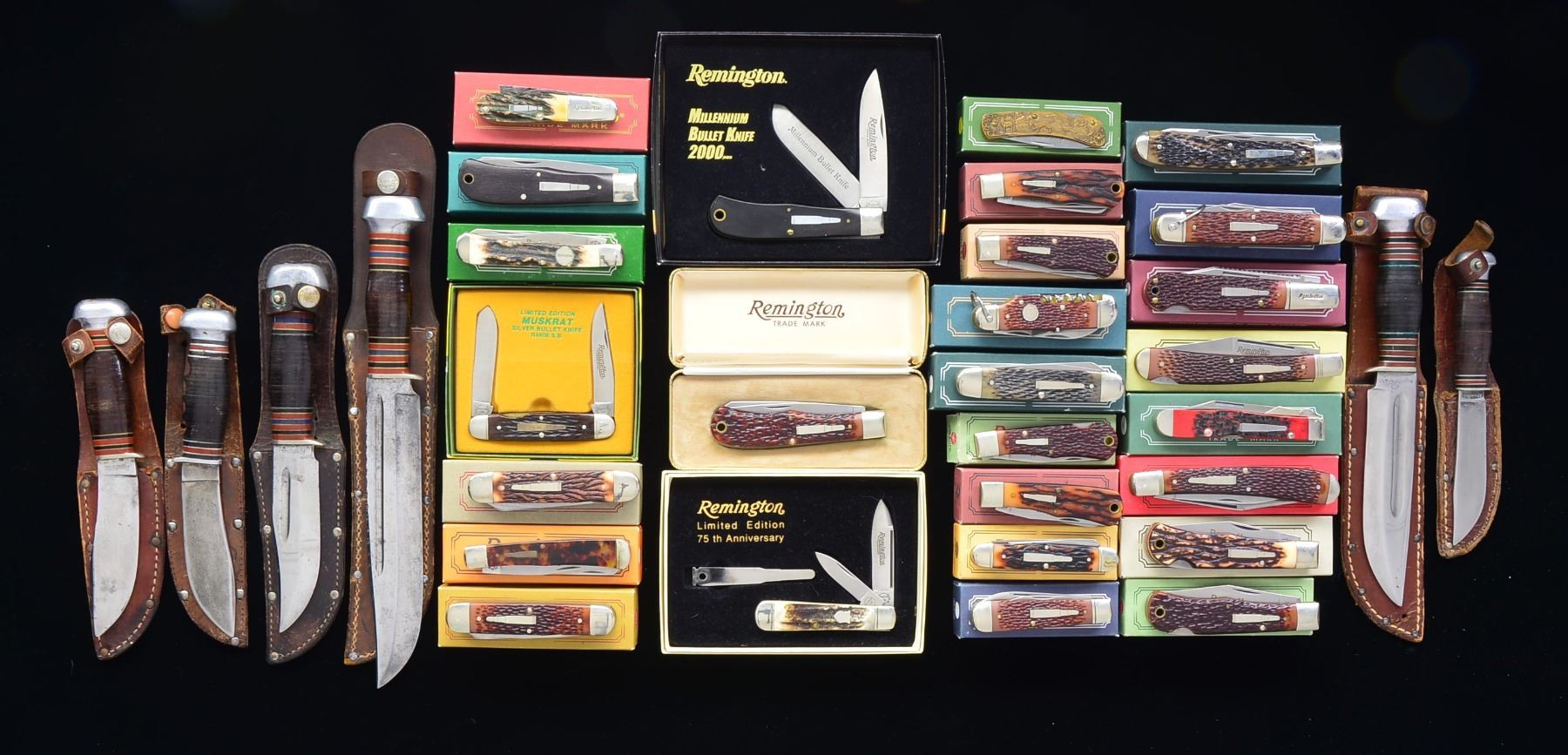 KNIVES. FOLDING: 25+ folding knives in original matching boxes. All have paperwork. Notable knives include: R106 70th Anniversary. / RE18862 Millenium bullet knife 2000. / R1123 4x6 folding knife w/ hinged leatherette case. / 1 Silver Bullet R4466SB Muskrat. / R1373 Renegade. / R1630 Navigator bullet knife. / R1253 Guide bullet knife. / R103 Ranch bullet knife. / R295T Apprentice bullet knife. / R4356 Bushpilot bullet knife. / CONDITION: knives are in near excellent condition. Boxes are generally very good condition w/ very light corner scuffing. FIXED BLADE: 1) 8" Fullered blade Bowie knife marked "RH38" w/ leather washer handles & alloy pommel. Leather sheath is marked "REMINGTON UMC". 2) 4 3/4" Fullered blade marked "REMINGTON RH34 - REMINGTON UMC - 5" " Has leather washer handle & alloy pommel. Leather sheath marked "REMINGTON UMC". 3) 4 1/2" Swept blade Skinner marked "REMINGTON RH32". Leather sheath is marked "REMINGTON UMC". 4) 6 1/8" Fullered blade knife marked "REMINGTON RH36 - 6 1/4". Leather washer handle w/ alloy pommel. Unmarked leather sheath. 5) 4 1/16" Blade marked "REMINGTON RH51". Leather washer handle & alloy pommel. Unmarked leather sheath. 6) 4 1/2" Swept blade marked "REMINGTON DUPONT RH-50". Leather washer handle w/ finger grooves & alloy pommel. Leather sheath marked w/ hand scratched initials "WFB". CONDITION: knives are in good serviceable condition, but blades have been cleaned & polished. Handle & pommels have light wear & scattered scratches. Leather scabbards have light wear, sm. tears at throat w/ staining & flexing. All appear in good serviceable condition. (02-13277/RW). $500-700.