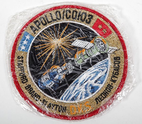 Astp, 1975, "Dks" Personalized Astp Crew Patch (5"). This heavily embroidered A-B Emblem patch has an oval sticker attached to the reverse that reads: "Made in USA by A-B Emblem Corp., Weaverville, NC" This patch was made specifically for Deke Slayton with his initials incorporated, in gold, into the design at the bottom of the design. A limited number of similar patches were made for each of rhe American crew members of the flight. This patch is in its original clear plastic envelope as originally received by Slayton. Rare and highly. Ex. the Astronaut Donald K. "Deke" Estate Collection.