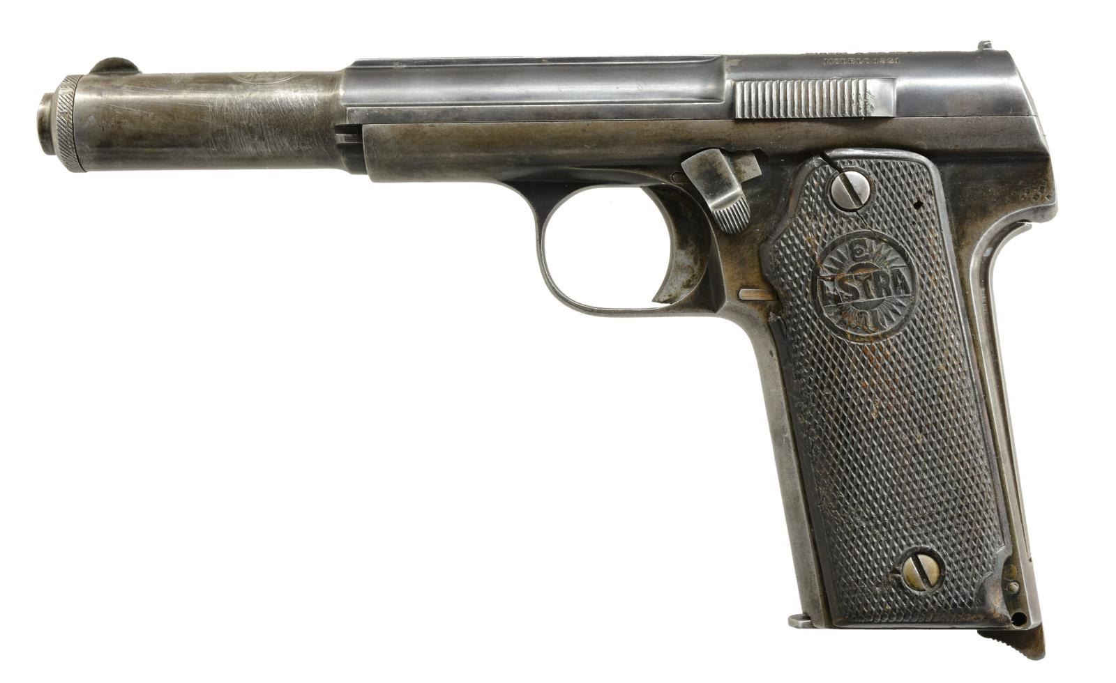 Cal. 9mm Largo. S# 12460. Bbl. 5.9". Blade front sight w/ fixed U notch rear sight. Bbl., slide & frame have matching S#'s. 2 Piece checkered composite grips w/ Astra medallions. MAGS: 1 detachable 8 rd. UNATTACHED ACCESSORIES: foam lined black molded Flambeau case containing 2 boxes 25 rds. of S&B 9mm Largo ammunition. CONDITION: slide & frame retain 40% dull blue in protected areas fading to gray showing carry wear w/ scattered scratches & sm. spots of corrosion. Sides of frame at back above grip safety have light vice or wrench marks. Bbl. bushing has wrench marks in areas of knurling loss. Grips have worn checkering & handling marks. Right panel has crack at heel & through upper screw area. Bore has slightly darkened appearance w/ lightly worn rifling. (21-804/DS). CURIO. $300-500.