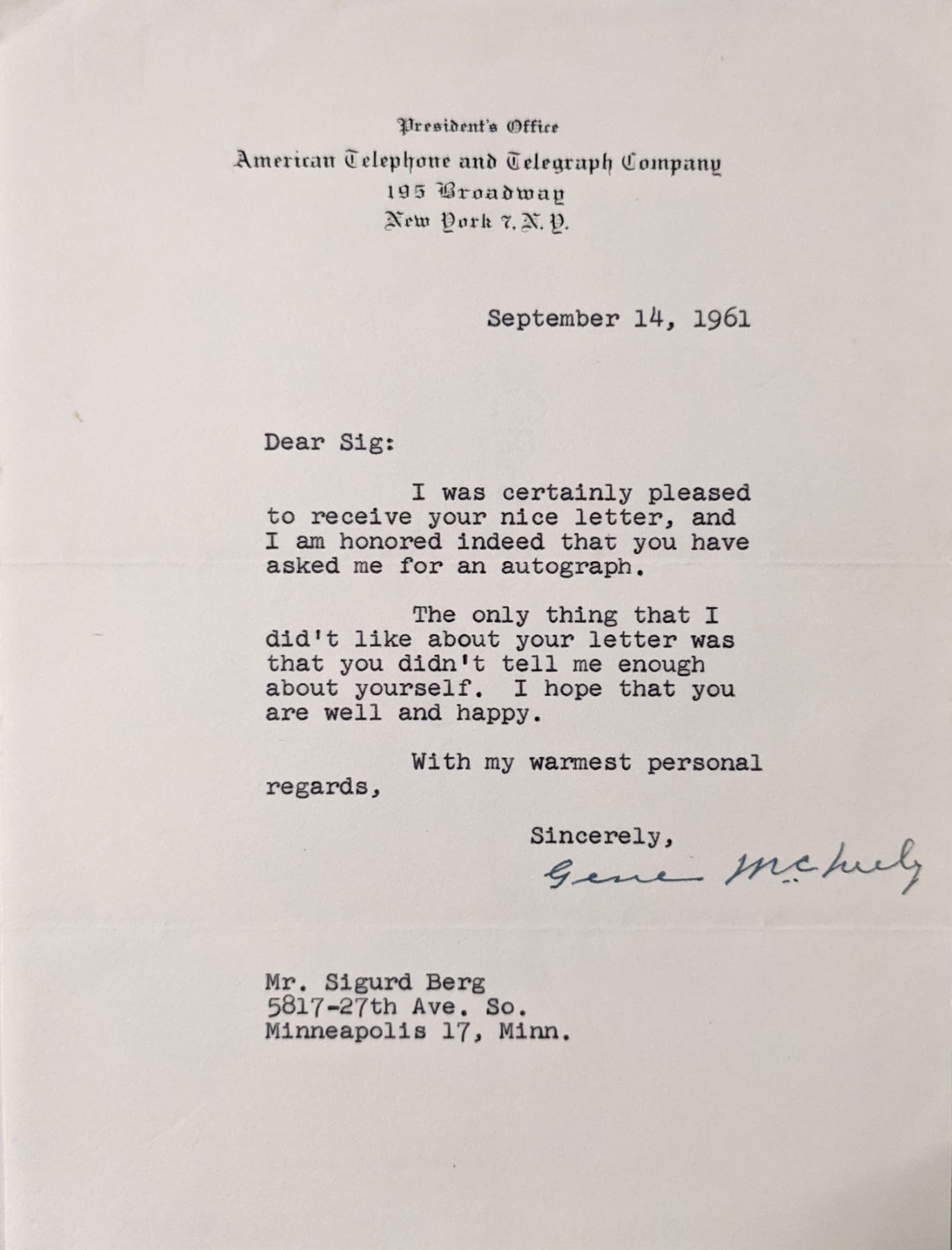 Gene McNeely Signed Letter. 7x9 inches
