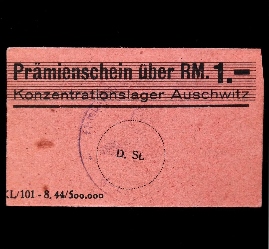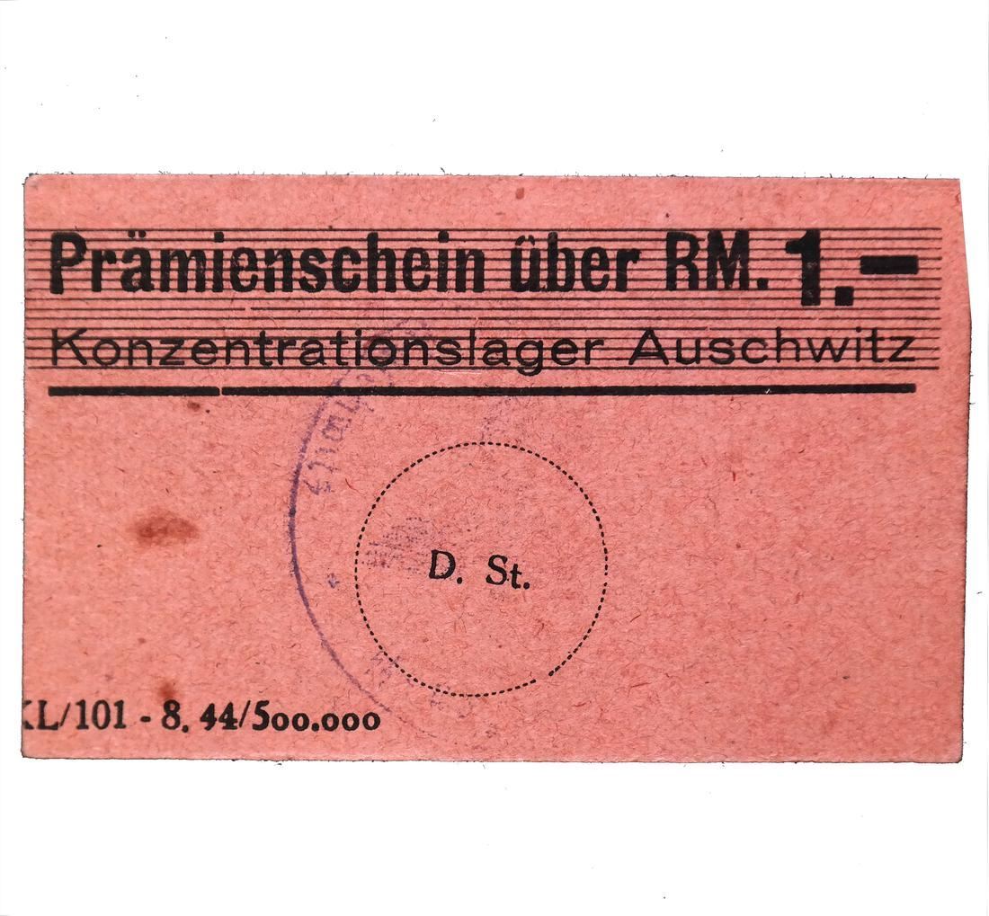 Prmienschein ber RM. 1.- / Konzentrationslager Auschwitz on light magenta card paper with Waffen SS control handstamp, measures approx 73 by 45mm, sound and VF-XF.