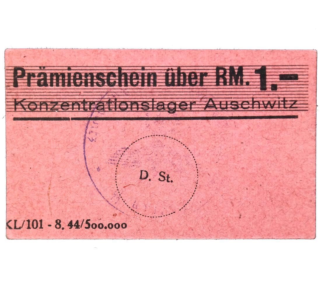 Prmienschein ber RM. 1.- / Konzentrationslager Auschwitz on light magenta card paper with Waffen SS control handstamp, measures approx 73 by 45mm, sound and VF-XF.