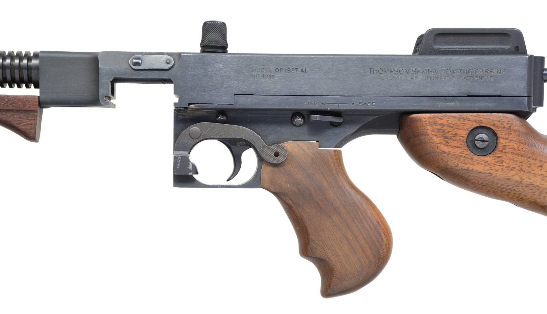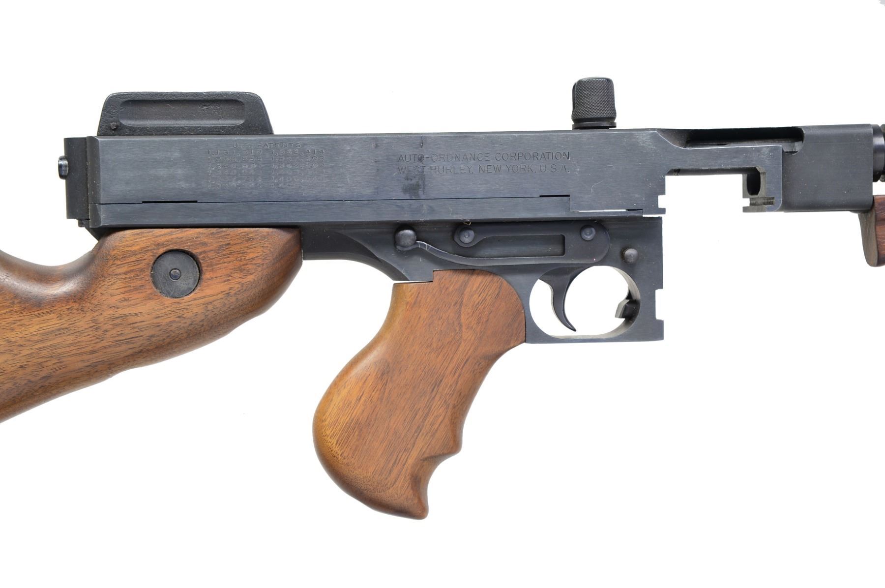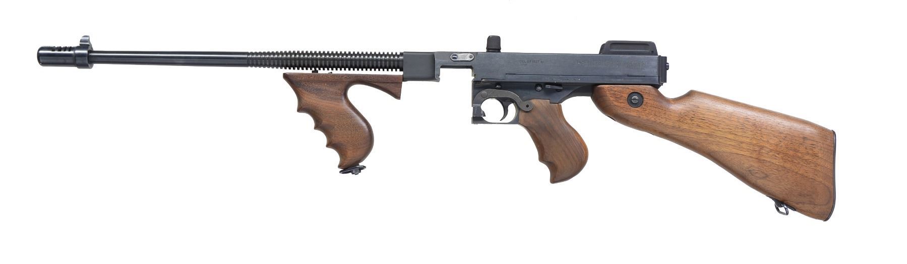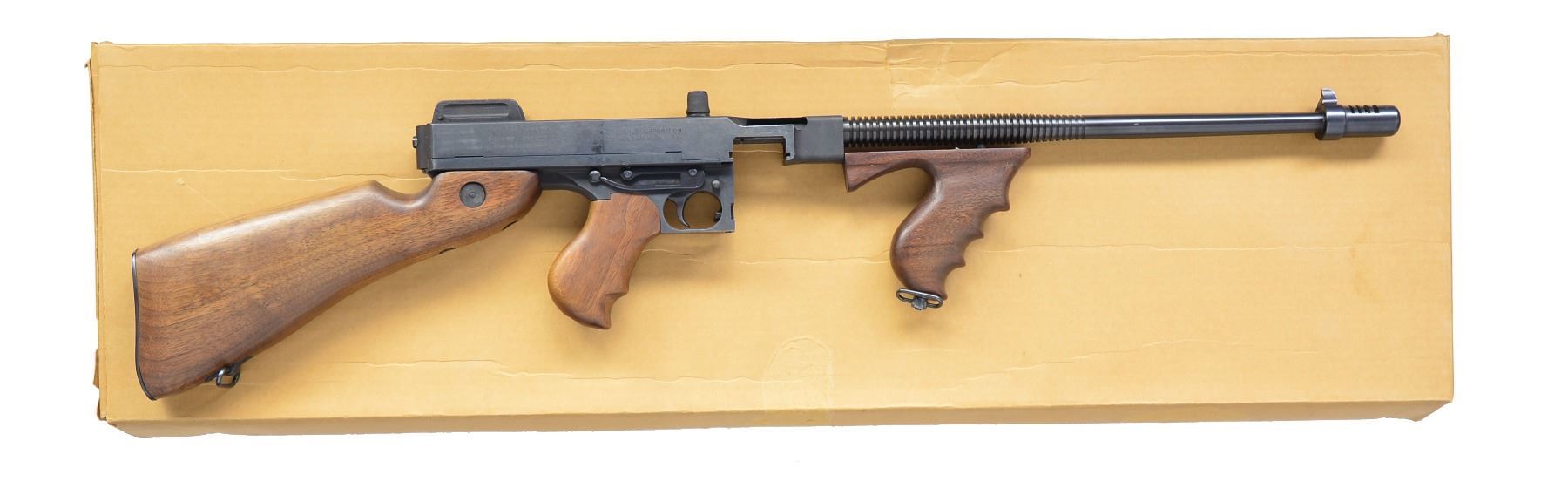 Cal. 45 ACP. S# 1239. Bbl 18 1/4" over Cutts compensator. A semi automatic variant of the famous model 1928 Tommy gun, "the gun that made the 20s roar" or the famous "Chicago typewriter". It features the iconic vertical foregrip & pistol grip w/ the classic hardwood stock & finned bbl. Blowback operated, closed bolt action. Knurled & slotted top mounted cocking handle. Front sight fixed on 4 slot Cutts compensator. Flip up ladder style rear sight. 36 Slot ribbed bbl. This version utilizes certain stick mags as well as drums. Blued finish. Hardwood stock & pistol grips. Bottom mounted sling swivels front & rear. MAGS: none. UNATTACHED ACCESSORIES: original inner/outer cardboard shipping box. CONDITION: shiny bore w/ strong rifling. Bluing on exposed metal surfaces is uniform & complete w/ a few light storage marks & thinning in area where trigger frame meets receiver. Mag release lever also displays thin finish. Wood has a few minor impressions, probably earned in storage. Fire control mechanism appears to function correctly when cycled by hand. (19-5888/JZ). MODERN. $800-1,200.