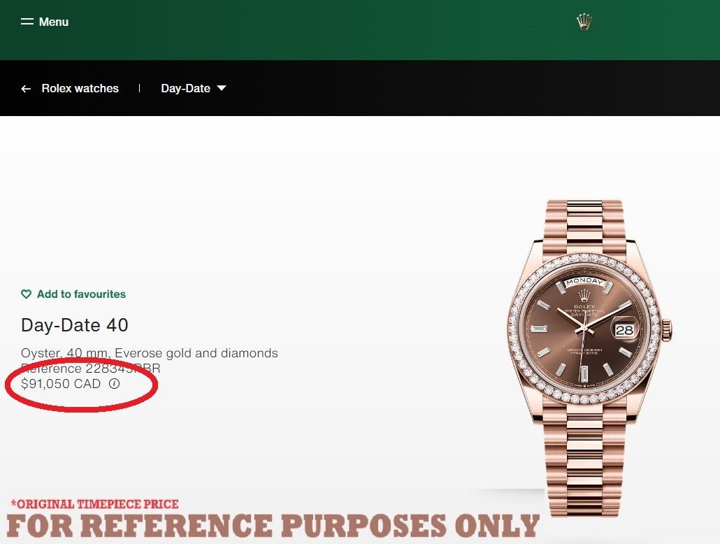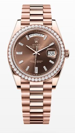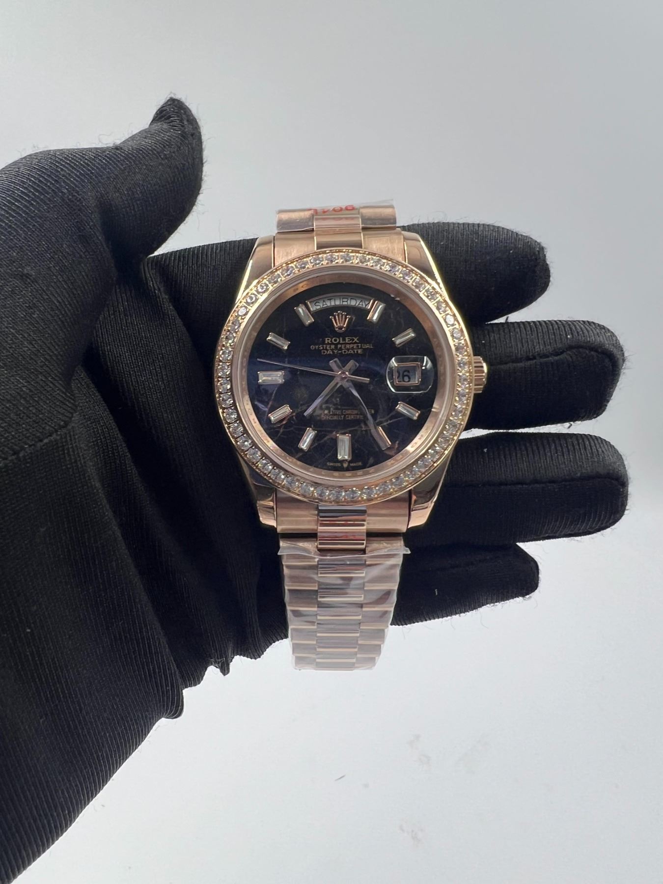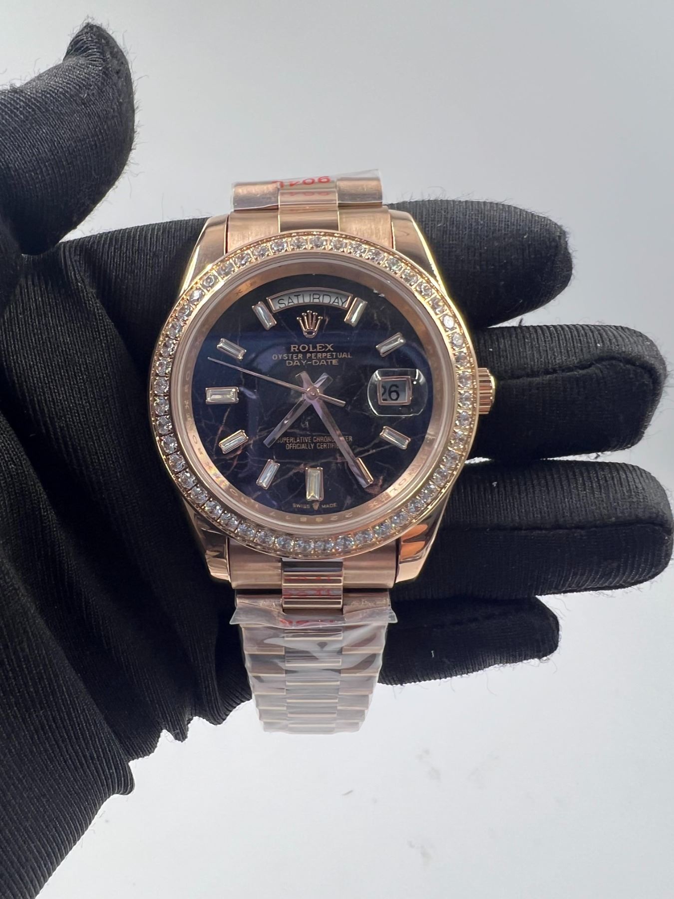 THE OYSTER PERPETUAL DAY-DATE 40 IN EVERROSE GOLD COLOR WITH A CRYSTAL BEZEL AND A JUBILEE BRACELET. BOX, TAG, PAPERS, BAG, ALL INCLUDED.THIS TIMEPIECE IS AN EXACT REPLICA OF THE ORIGINAL. **ALL ITEMS MUST BE REMOVED BY 5PM SATURDAY, DECEMBER 20TH 2025. ALL REMAINING ITEMS WILL BE SUBJECT TO A $6.00 PER DAY STORAGE CHARGE. ANY ITEMS REMAINING AFTER MONDAY, JANUARY 5TH 2026 WILL BE CONSIDERED FORFEITED. NO REFUNDS WILL BE ISSUED FOR FORFEITED ITEMS. TO SCHEDULE A PICK UP APPOINTMENT CLICK HERE