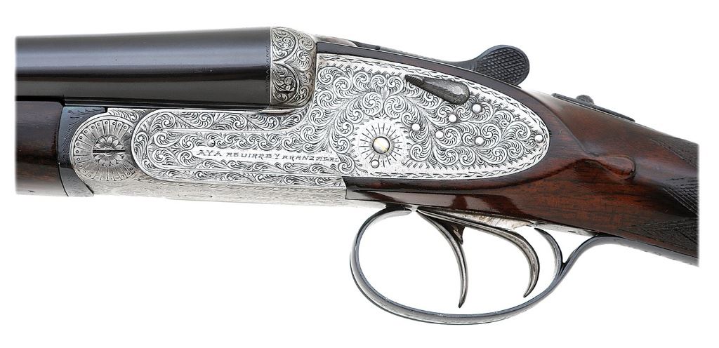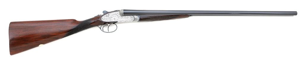 serial #134971, 16 ga (2 3/4”), 28” barrels choked modified and a tight full, with bright excellent bores. The barrels retain about 98% original blue with some light handling marks on the side of the right breech and a touch of wear at the muzzles, and the coin finished frame is in excellent condition and is factory embellished with full coverage tight scroll engraving, bordering, and floral motifs on the hinge pin. The checkered straight grip walnut stock and splinter-style forend are in very good plus to near excellent condition with some light handling marks and minor dings and some scattered flattened points of checkering. The buttstock sports an unengraved oval monogram plate on the toeline and a checkered butt which provides a 14 3/4” length of pull with drops of 1 5/8” and 2 1/8”. The shotgun locks up tight and on-face with the lever coming to rest at center, and features dual triggers, an automatic safety, cocking indicators, robust ejectors, hand detachable locks, a rolled right edge on the triggerguard, and is sighted with a lone steel bead on the game rib. Shotgun weighs 6lbs 3 oz. A lovely 1960’s vintage Spanish ejectorgun with plenty of life left in it. (14B11778-17) {C&R} (2500/4000)