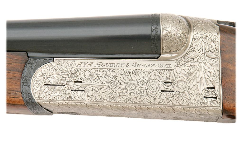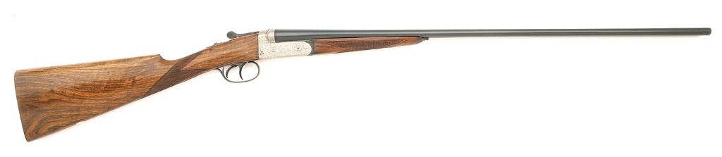 serial #16-03-187-13, 410 bore 3" 29" barrels choked improved cylinder and modified with bright excellent bores. This shotgun was imported and sold through New England Custom Gun and features a coin finished action with full coverage foliate scroll engraving. The gun is in a lovely configuration with straight grip buttstock, semi-beavertail forend, double triggers and automatic safety. The condition of the gun is near new with the barrels retaining 99% original blue, the action remains bright and the nicely figured walnut stocks rate excellent with 99% original finish remaining. The checkering on wrist, forend and butt all remains crisp. The gun has nice dimensions with a 14 7/8" length of pull and showing drops of 1 1/2" and 2 1/4". The gun weighs 5 3/4 lbs. and with the long tubes it swings and handles beautifully. (11739-126) {MODERN} (2000/4000)